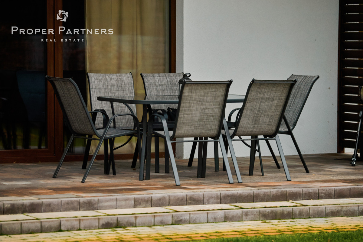 Z salonu prowadzi wyjście na zadaszony taras o powierzchni ok. 20 m² - idealne miejsce na poranną kawę, odpoczynek po lesie czy letnie kolacje.