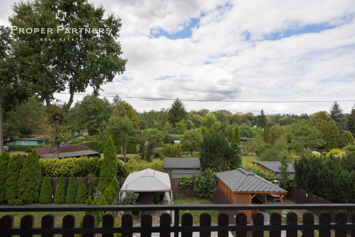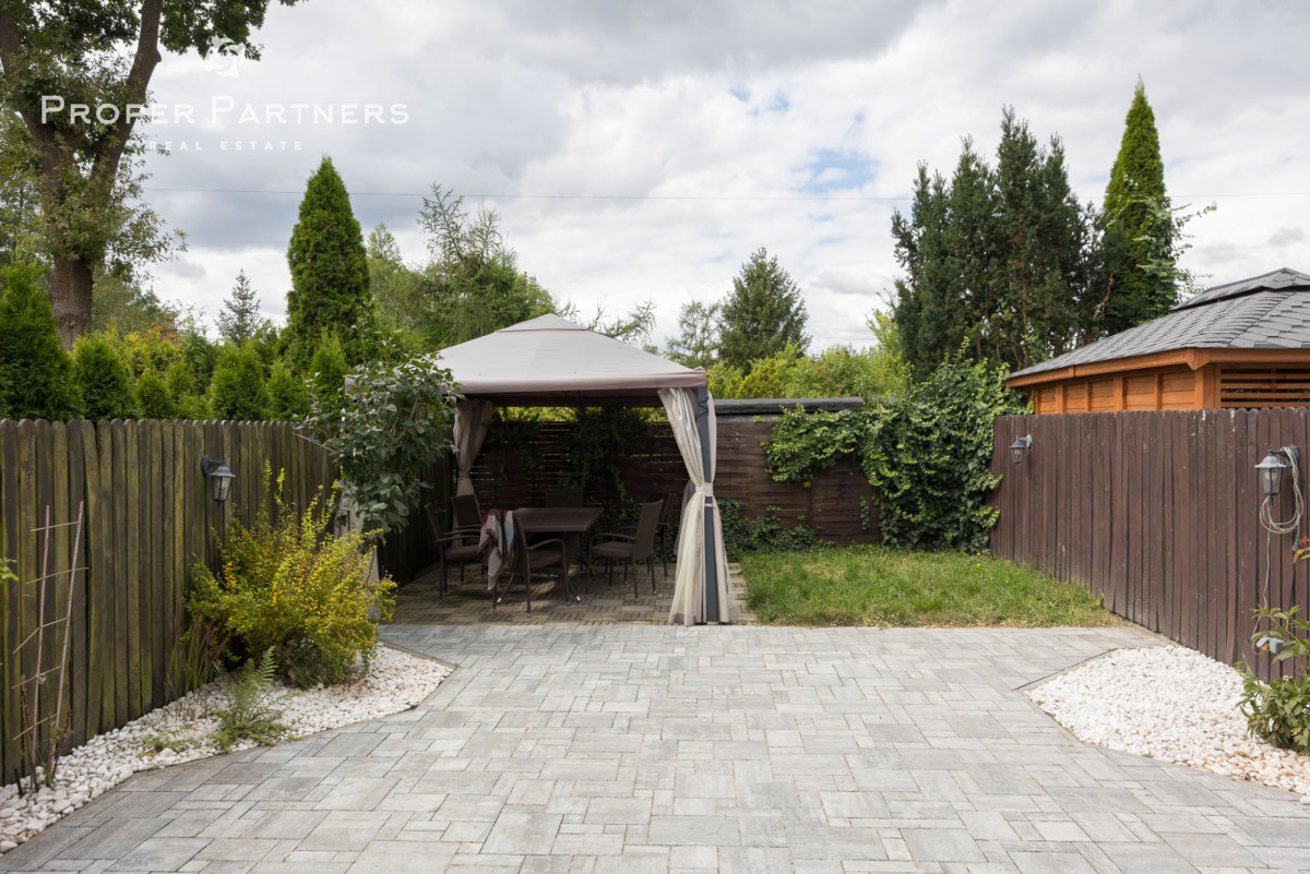 Ogródek kwiatowy ok. 160 m2 z instalacją elektryczną i oświetleniową sterowaną radiowo (2 piloty), pawilon 12 m2, stanowisko grillowe, stół i fotele dla 8 osób.