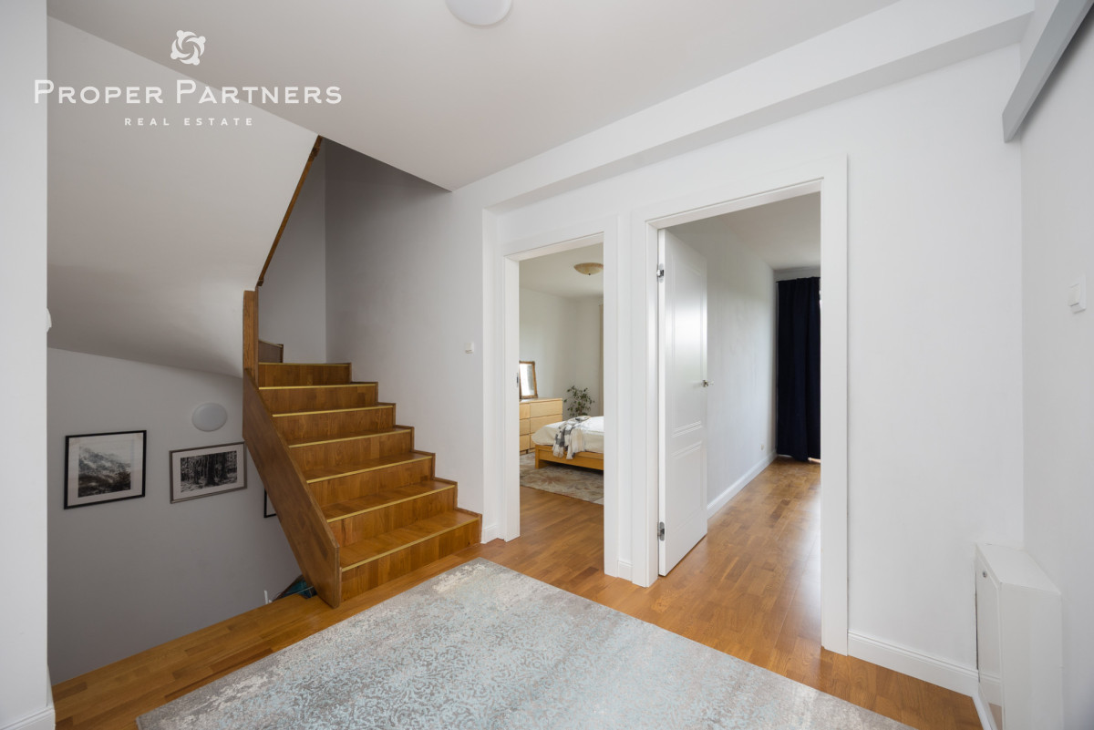 Podłogi w salonie, trzech sypialniach oraz na schodach z selekcjonowanego dębu złocistego.