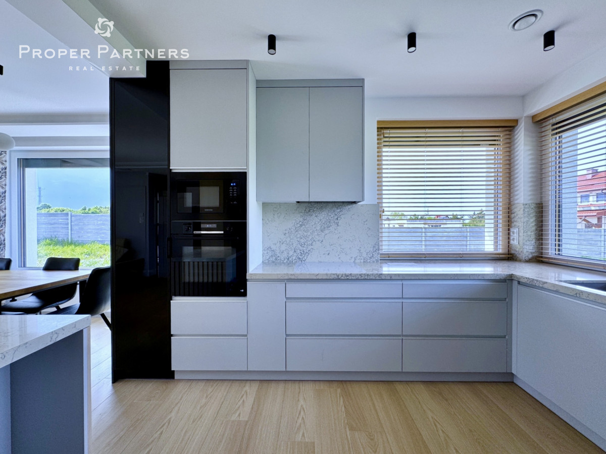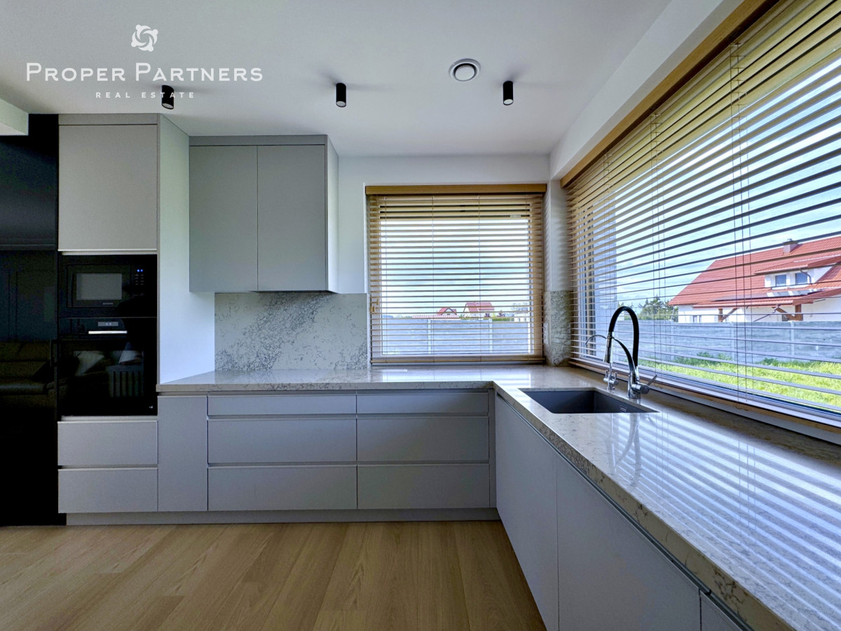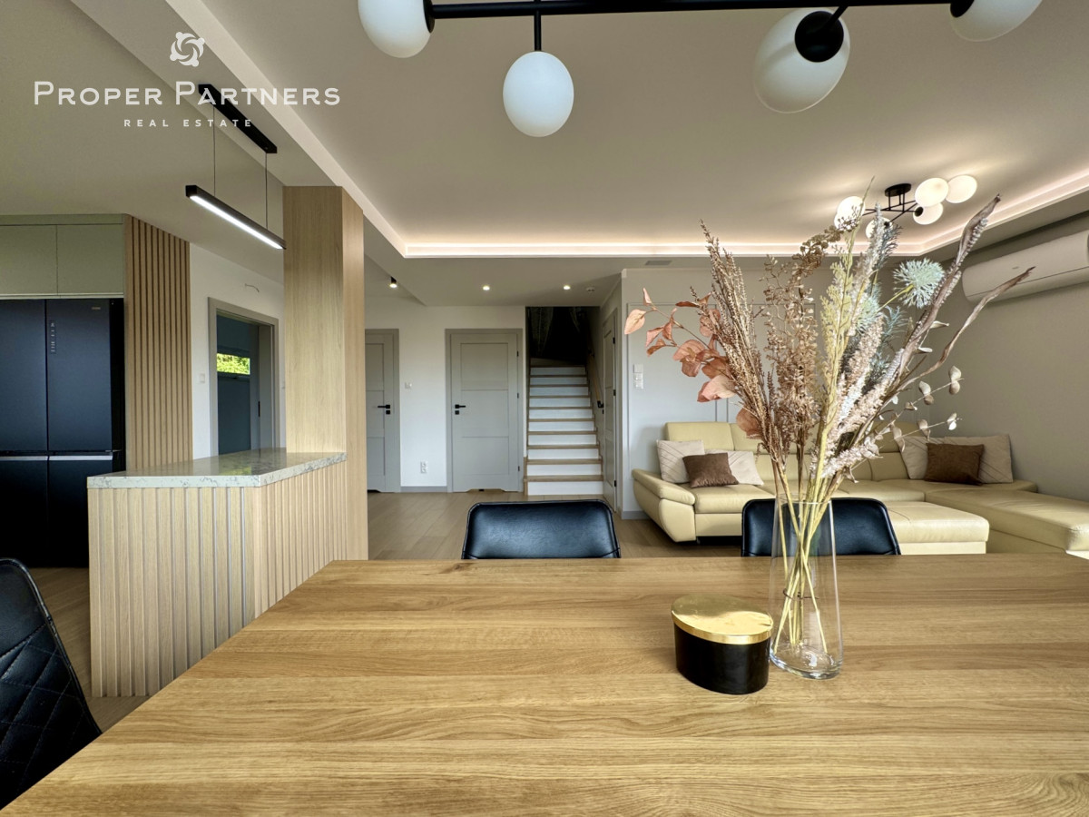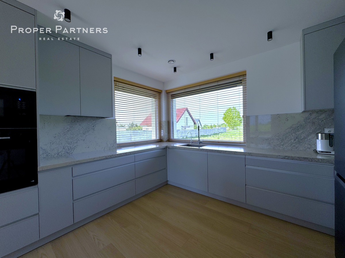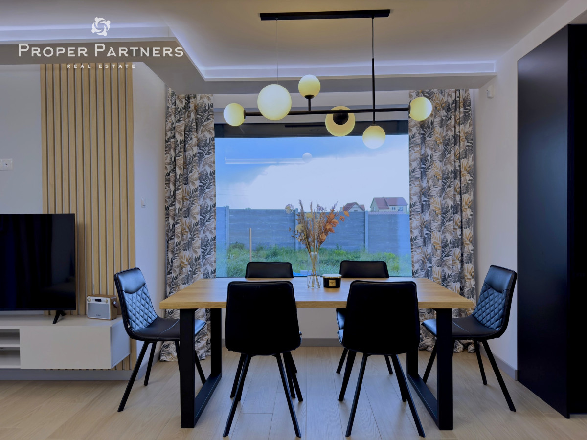 Dom wykończony jest w wysokim standardzie, z użyciem trwałych, nowoczesnych materiałów. Dominują naturalne kolory i drewniane akcenty, które tworzą przytulną, a zarazem elegancką atmosferę.