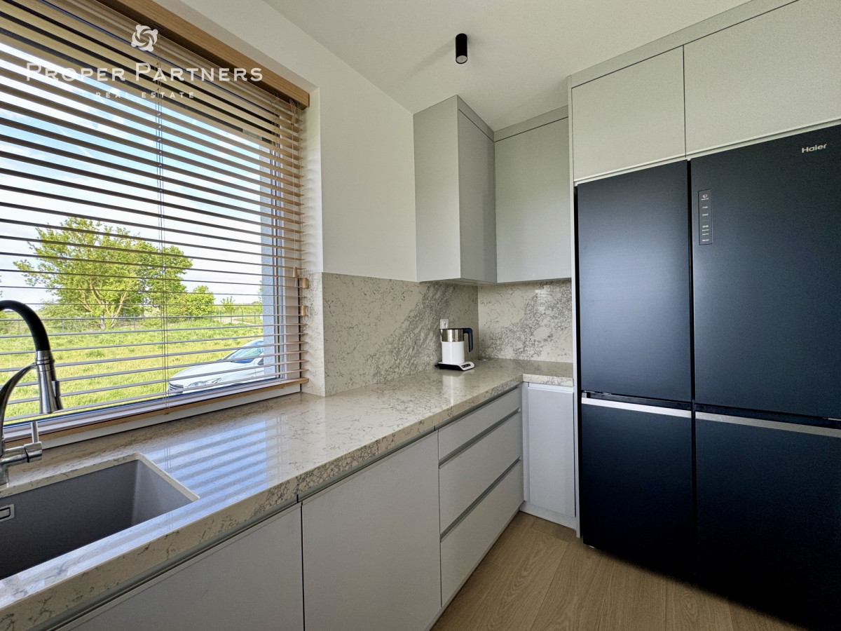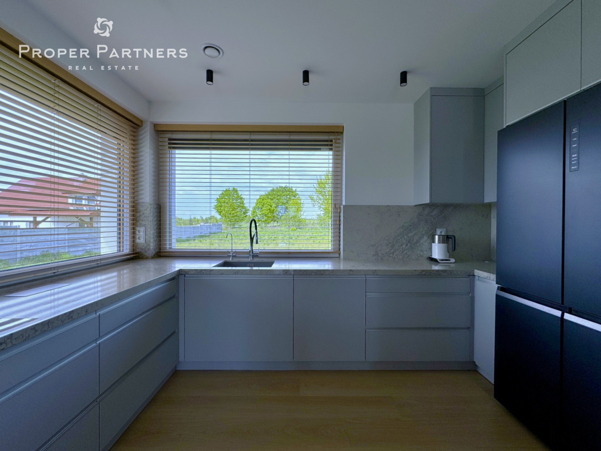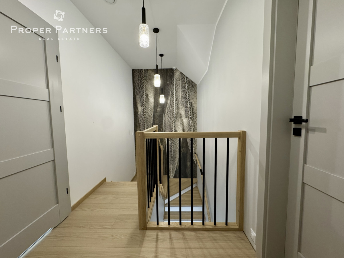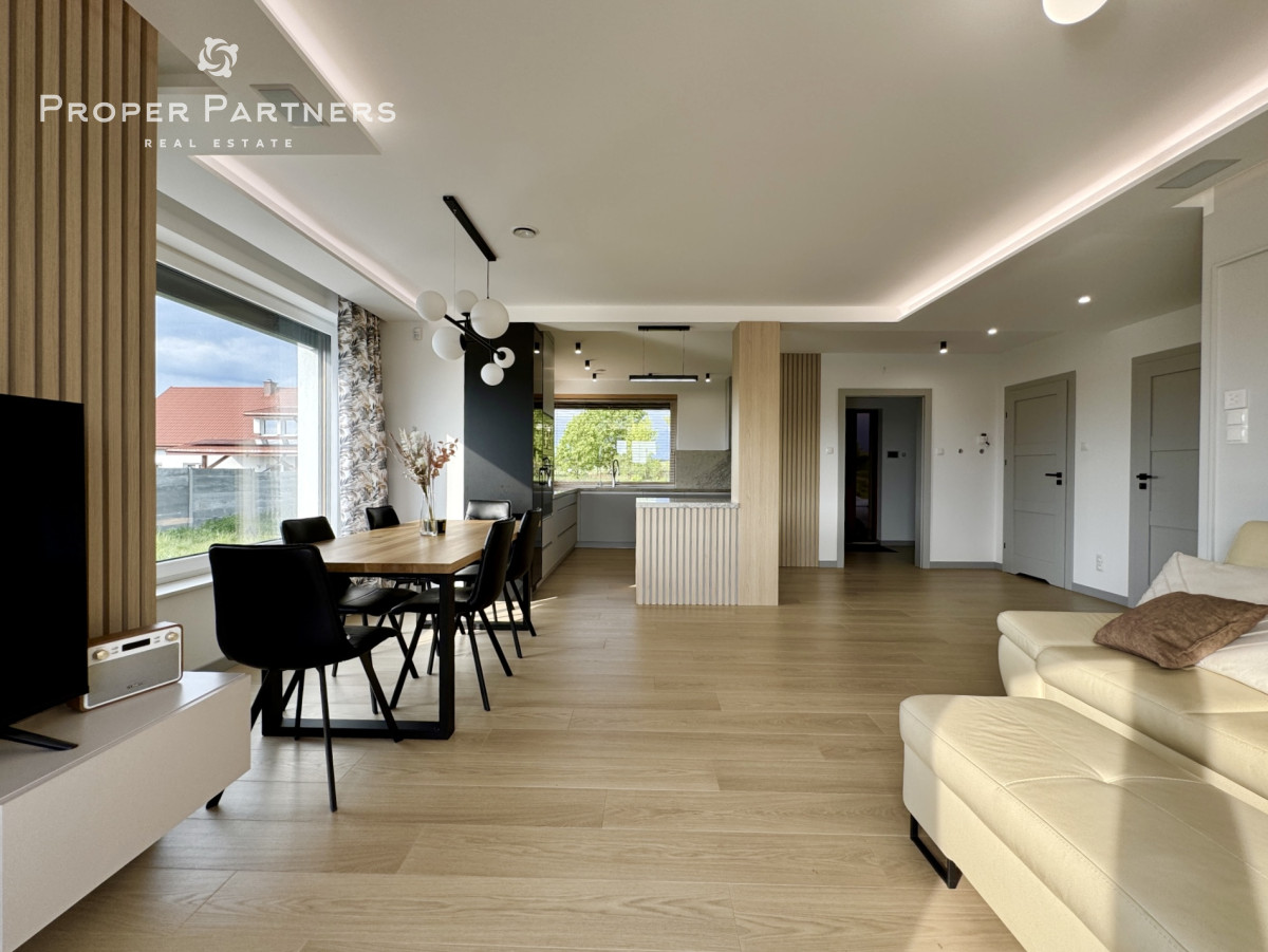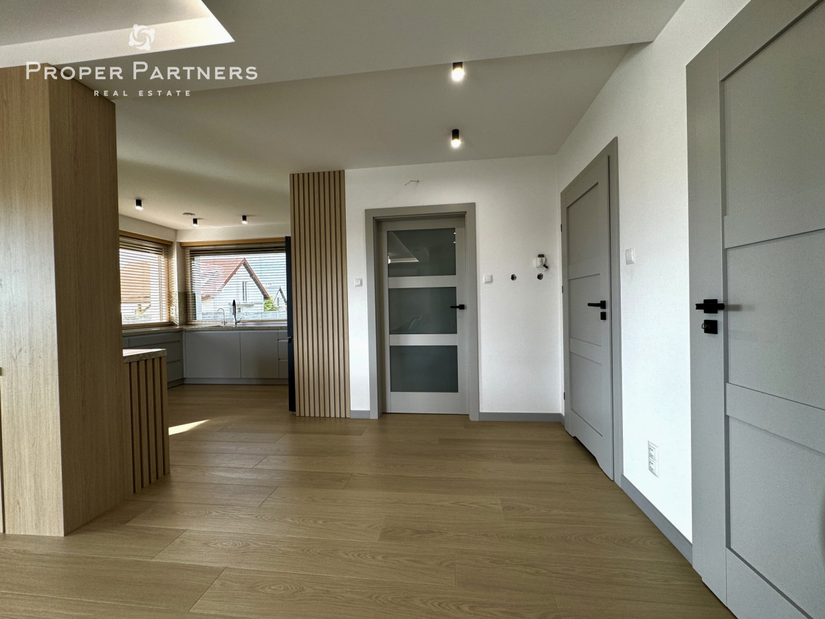 Dom wykończony jest w wysokim standardzie, z użyciem trwałych, nowoczesnych materiałów. Dominują naturalne kolory i drewniane akcenty, które tworzą przytulną, a zarazem elegancką atmosferę.