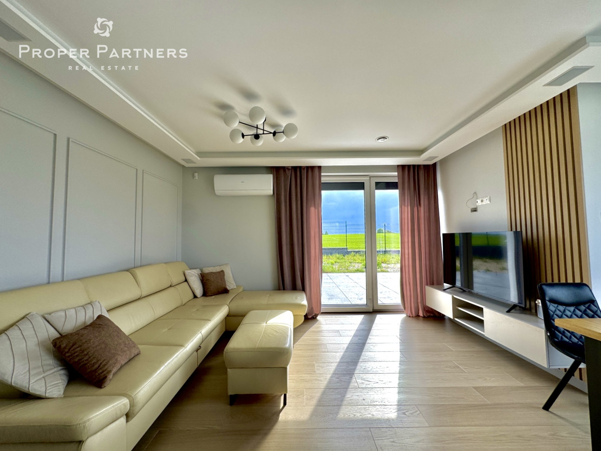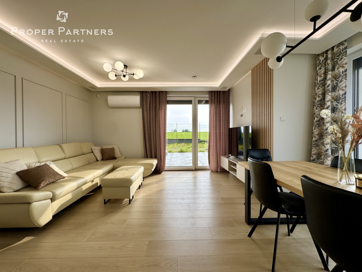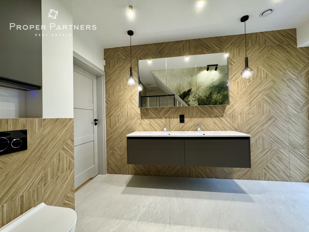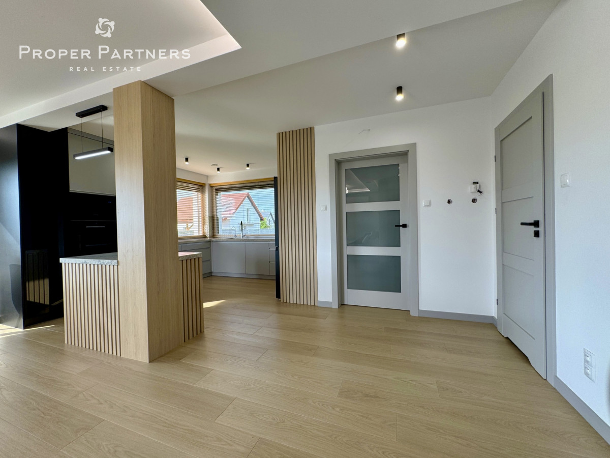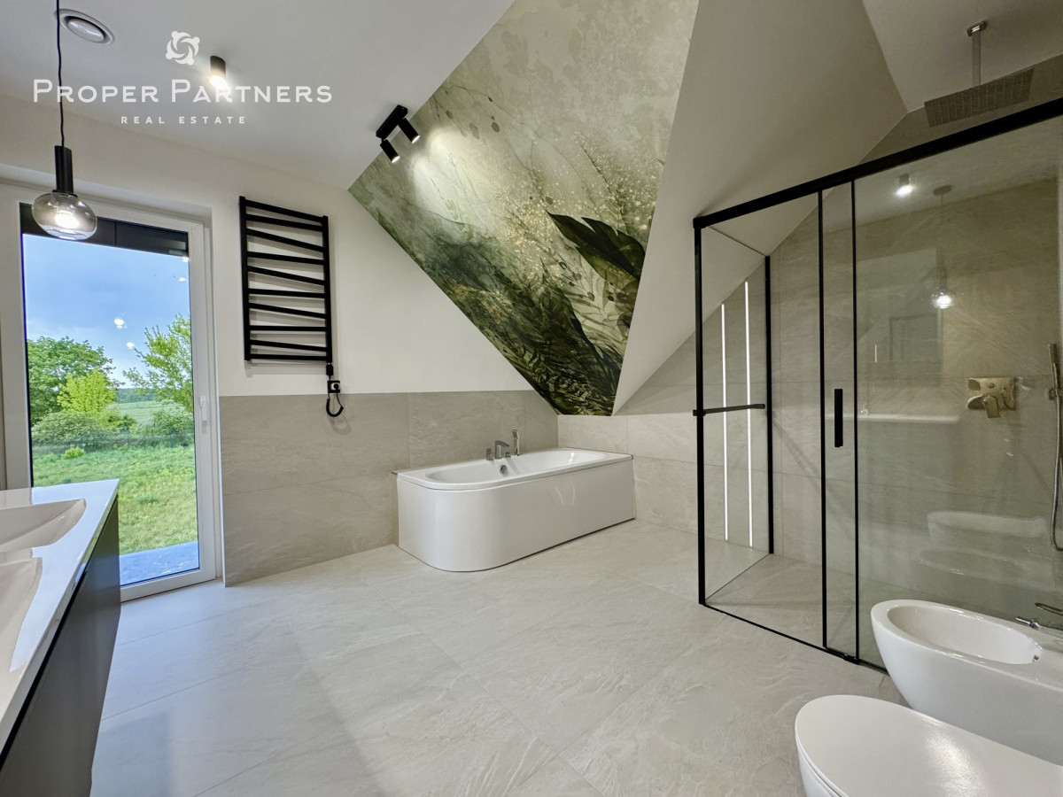 Dom wykończony jest w wysokim standardzie, z użyciem trwałych, nowoczesnych materiałów. Dominują naturalne kolory i drewniane akcenty, które tworzą przytulną, a zarazem elegancką atmosferę.