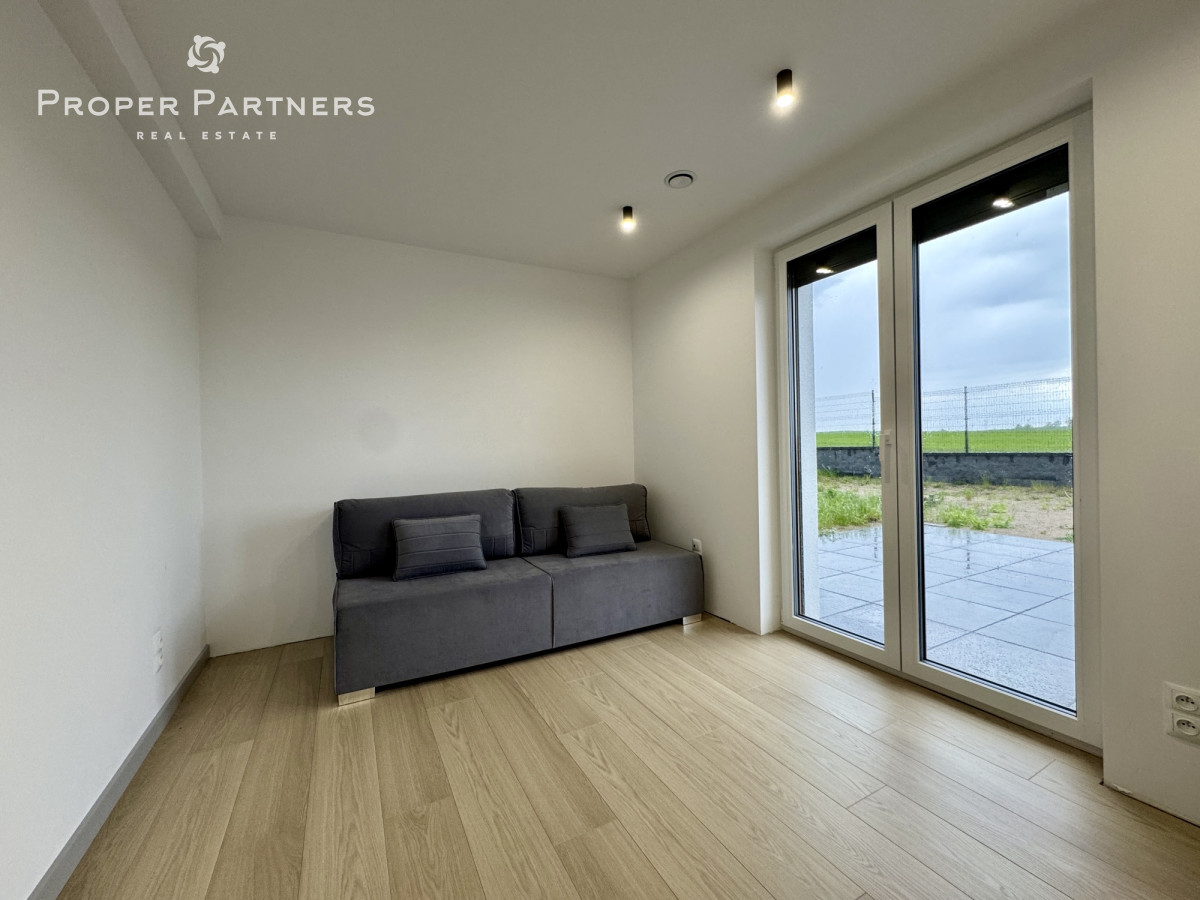 - Przestronny salon połączony z jadalnią oraz otwartą kuchnią - serce domu, idealne do wspólnego spędzania czasu; liczne okna i wyjście do ogrodu zapewniają naturalne doświetlenie wnętrza.