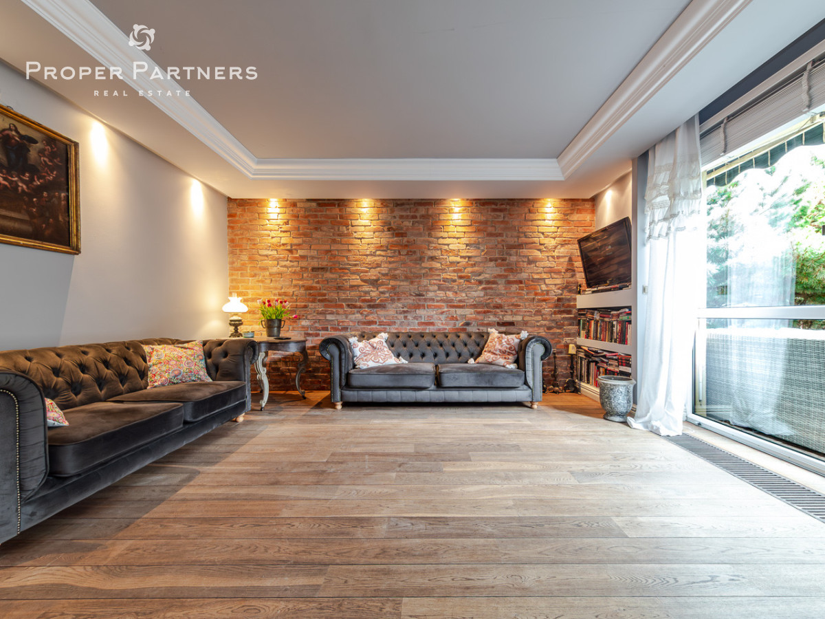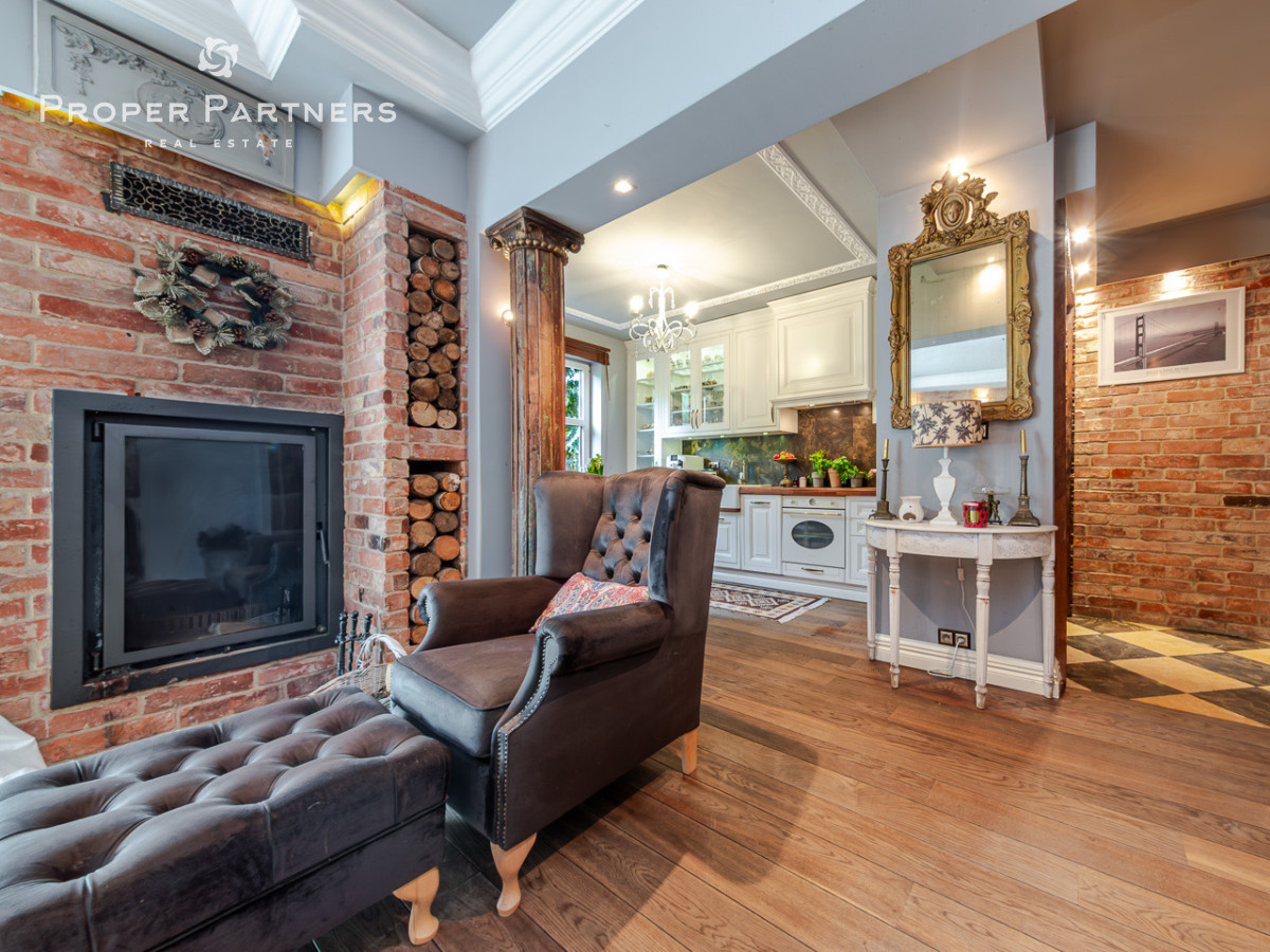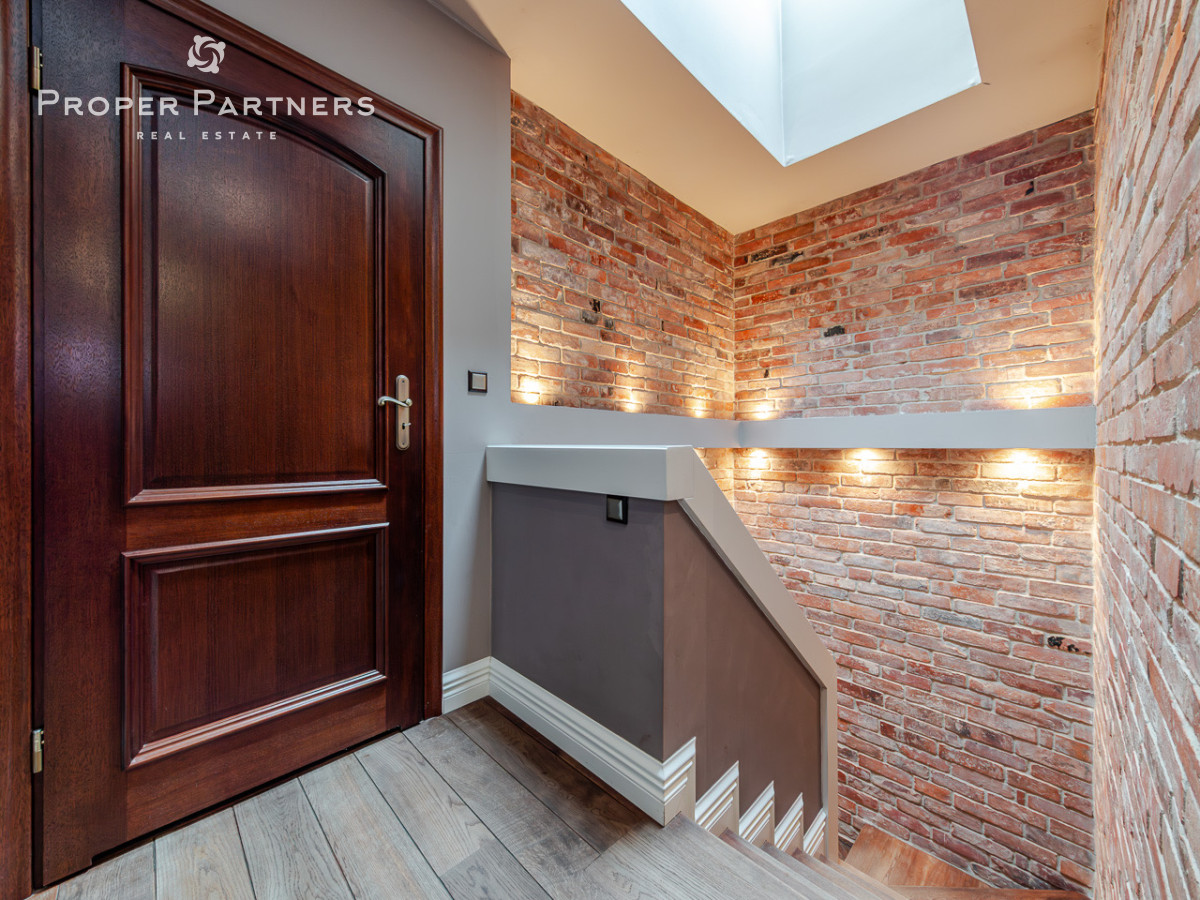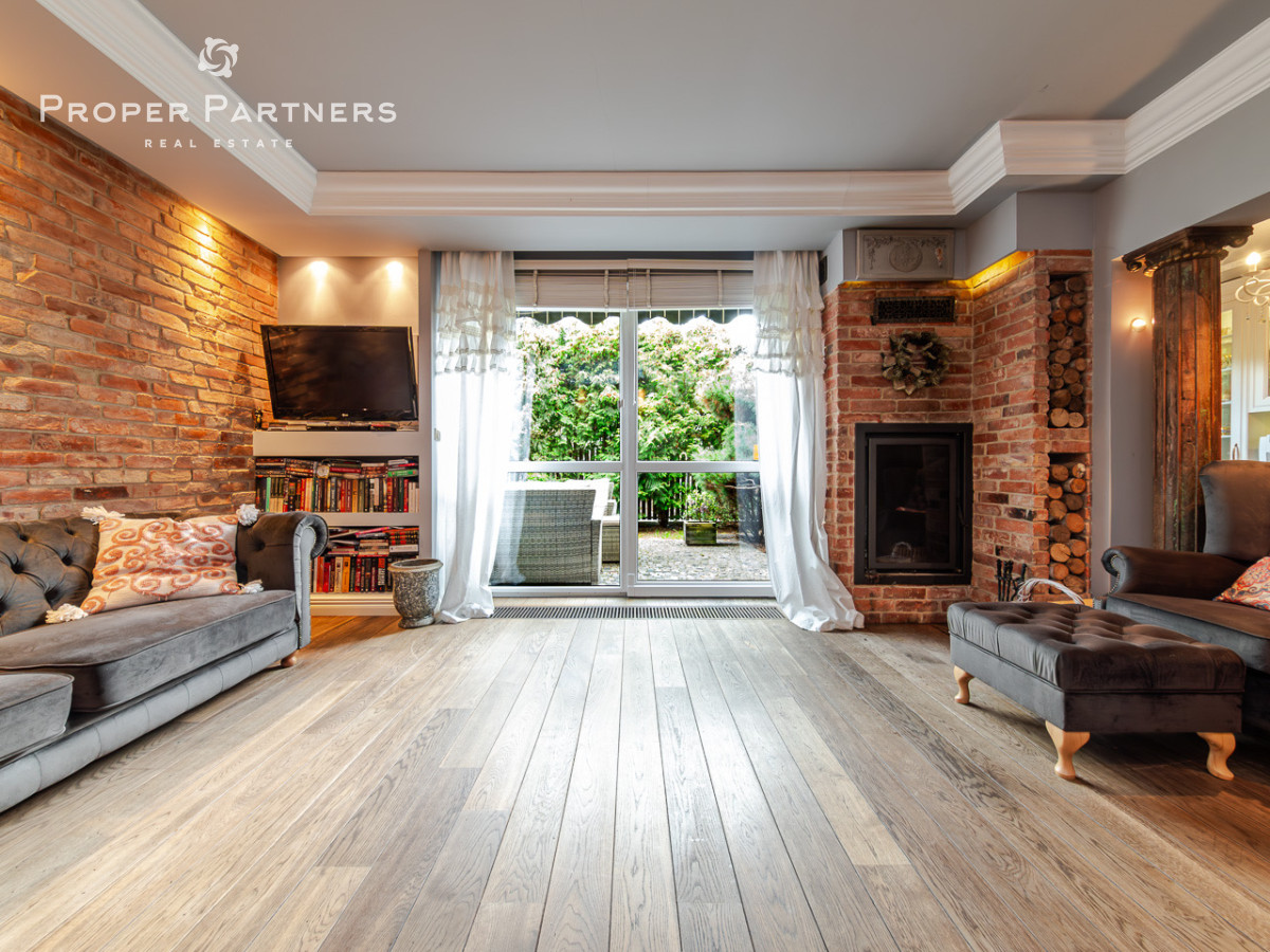 • oryginalna cegła na ścianach (salon oraz klatka schodowa)