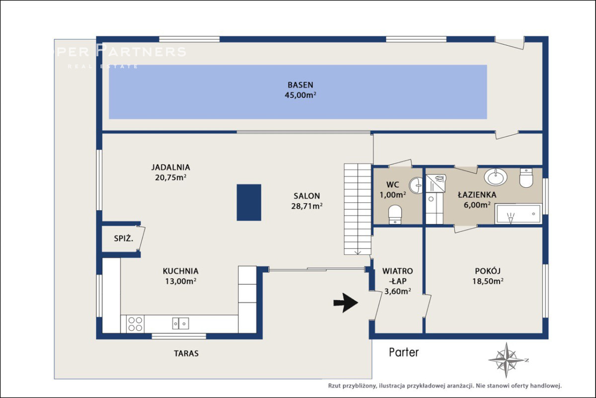 Na parterze mamy przestronny salon z jadalnią i kominkiem, kuchnię ze spiżarnią, pokój, łazienkę z wc, wiatrołap oraz basen.