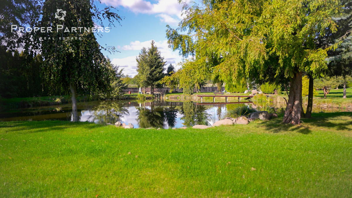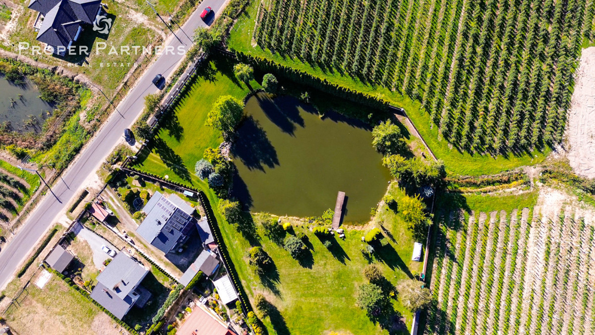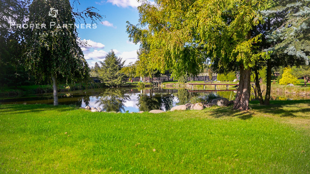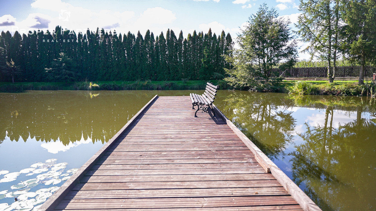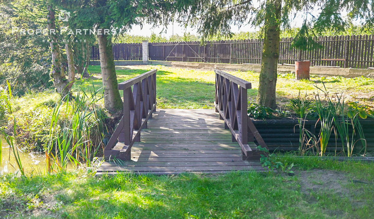 Działka zachwyca pięknym, zadbanym ogrodem oraz dużym stawem, który dodaje jej unikalnego charakteru. Przy stawie znajduje się solidny drewniany pomost, który stwarza idealne miejsce do wypoczynku i relaksu na świeżym powietrzu. Całość otoczona jest zielenią drzew i krzewów, które zapewniają prywatność oraz niepowtarzalny krajobraz o każdej porze roku.