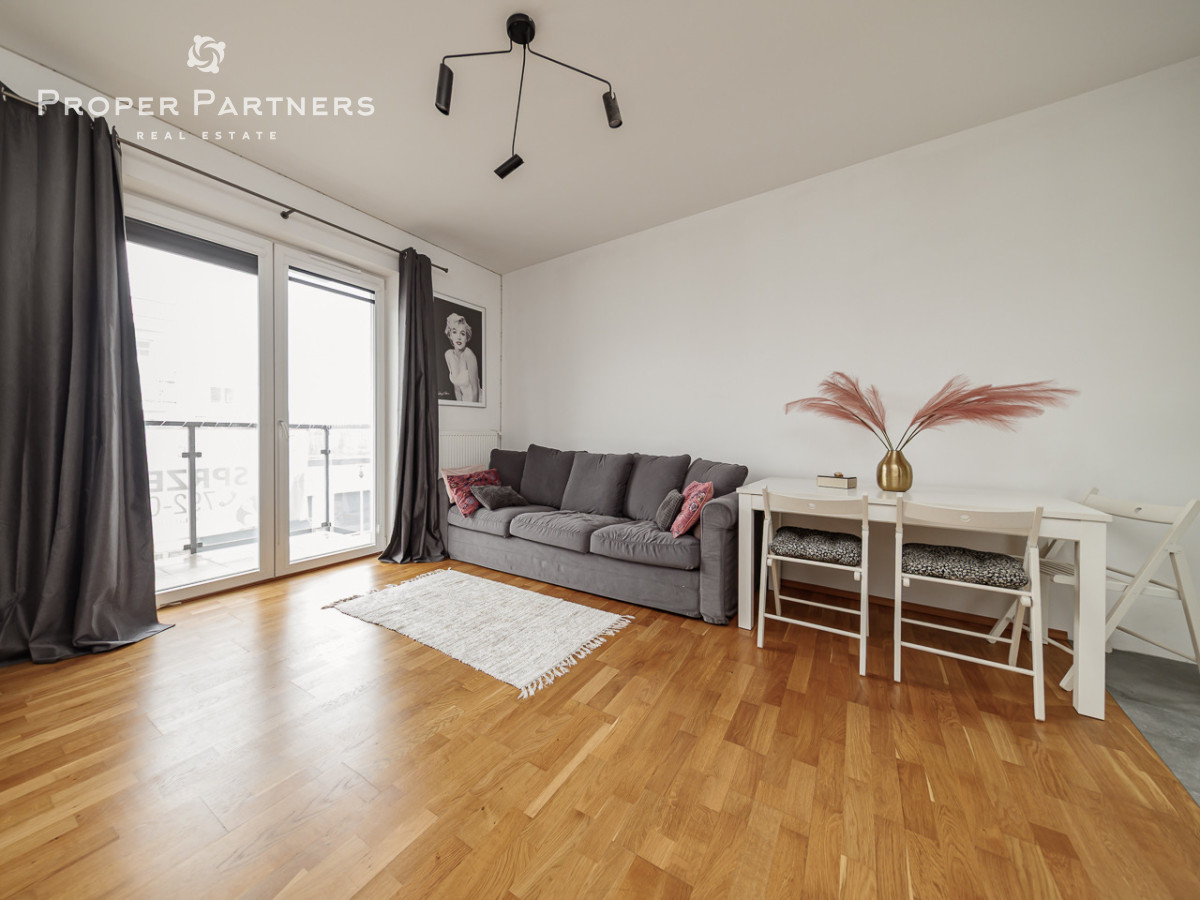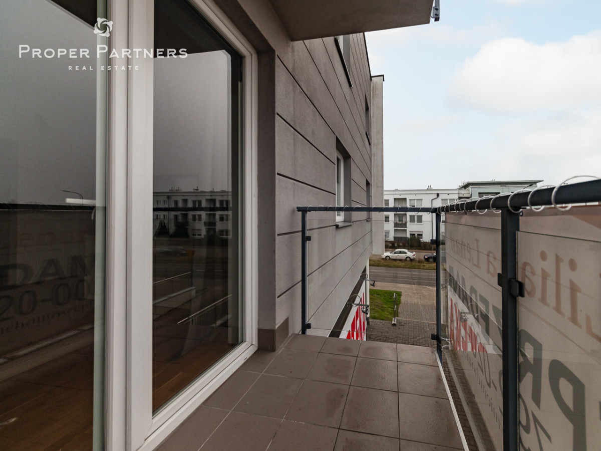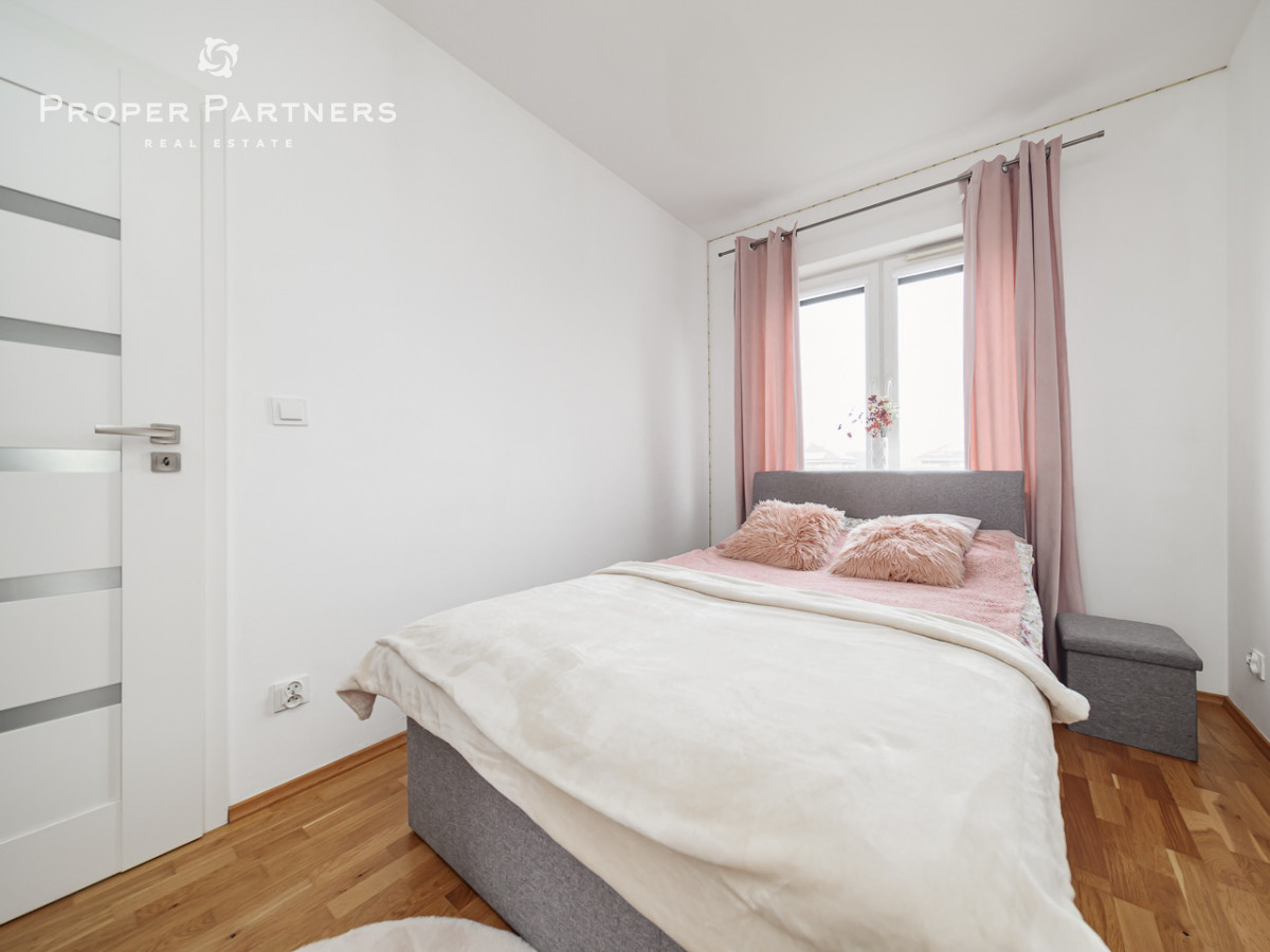Mieszkanie znajduje się na pierwszym piętrze. Składa się z jasnego salonu z otwartą, widną kuchnią, ustawnej sypialni, łazienki z oknem, a także przedpokoju z dużą, wbudowaną szafą.