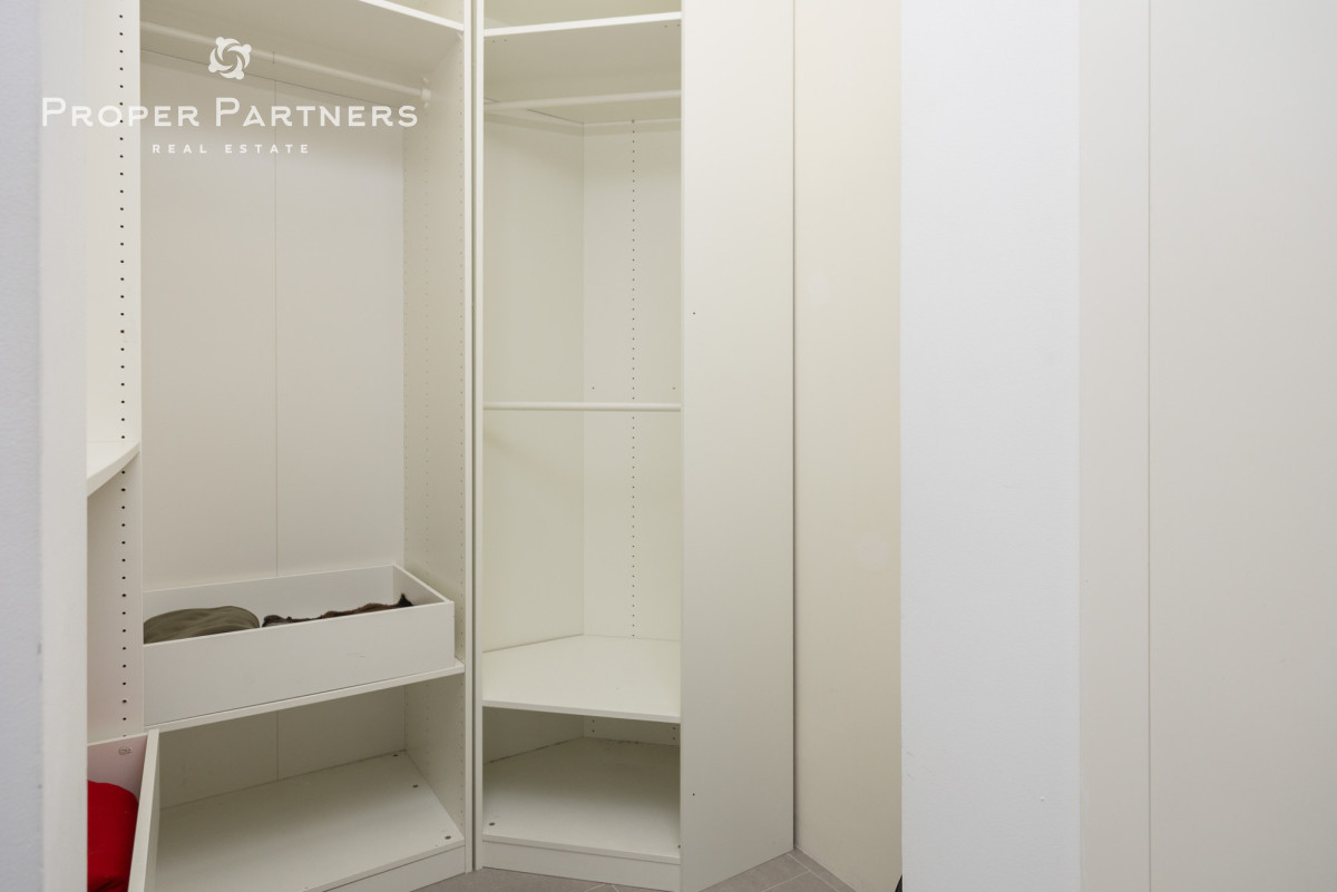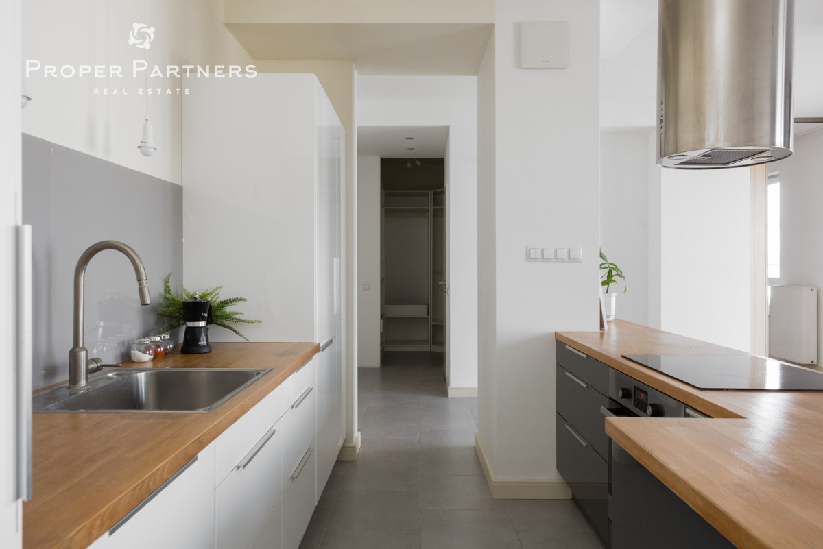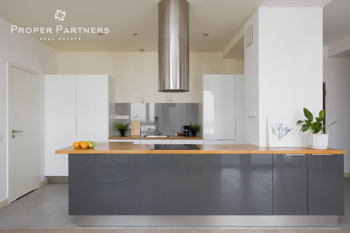 - kuchnia z wyspą, jasna, dużo powierzchni roboczej (meble w zabudowie, lodówka, zamrażarka, zmywarka, okap, piekarnik, zlewozmywak, płyta elektryczna)