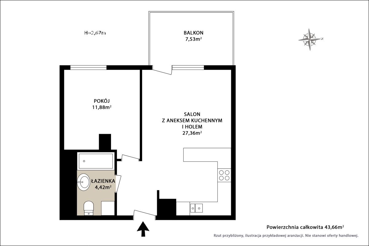 - Łazienka(4,42 m²) - funkcjonalna i wygodna w codziennym użytkowaniu.