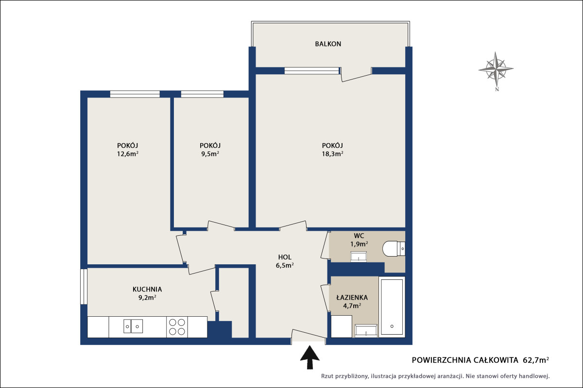 Mieszkanie składa się z salonu z wyjściem na balkon, dwóch oddzielnych sypialni, osobnej kuchni z oknem, łazienki oraz oddzielnego WC.
