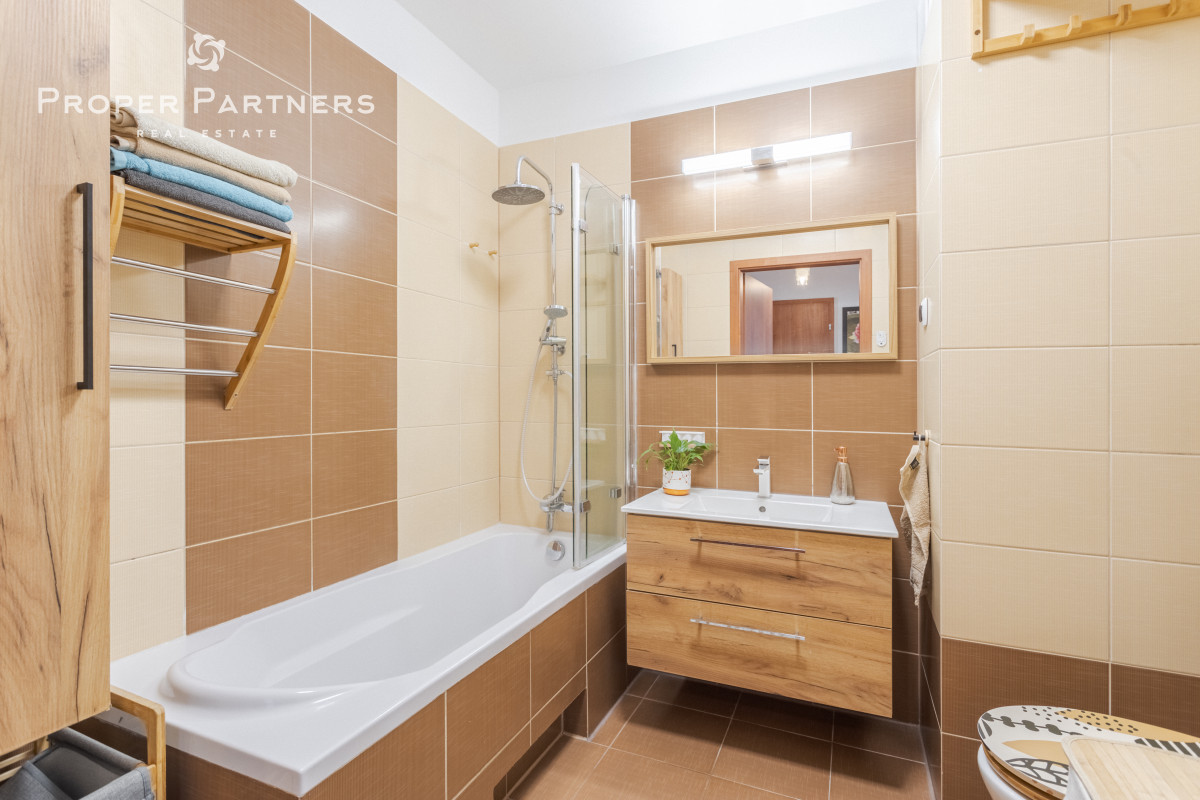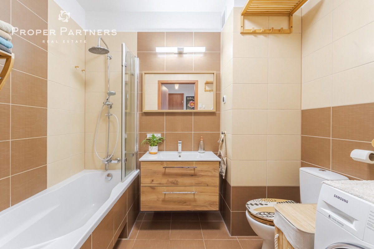 Łazienka wyposażona została w wannę, umywalkę oraz szafkę wc. Kolejne WC jest w oddzielnym pomieszczeniu.