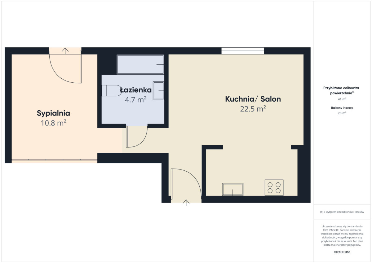 - Salon z aneksem kuchennym (19,2 m²) - jasna, otwarta przestrzeń z bezpośrednim wyjściem na taras.