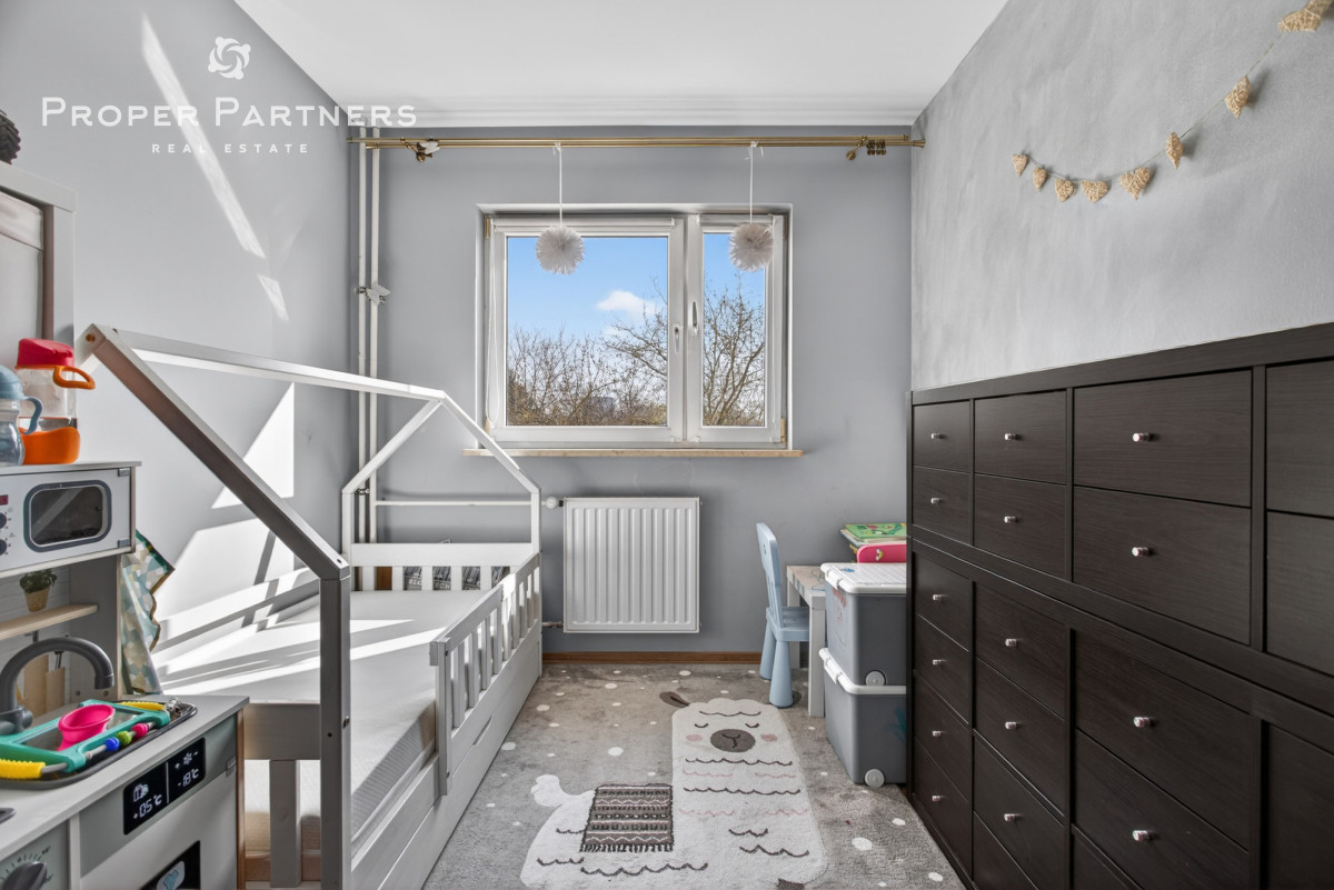 - Pokój (9,3 m²) - idealny na sypialnię lub gabinet, obecnie stanowi pokój dla dziecka.