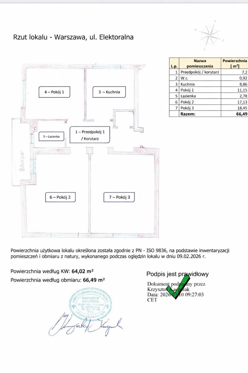 - rzeczywista powierzchnia według obmiaru rzeczoznawcy (PN-ISO 9836): 66,49 m²