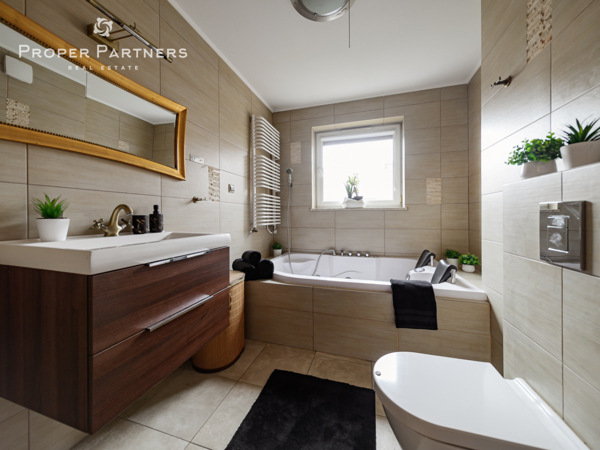 Dwie łazienki - jedna z wanną z hydromasażem a druga z prysznicem. Praktyczny układ umożliwia wygodne korzystanie wszystkim domownikom.