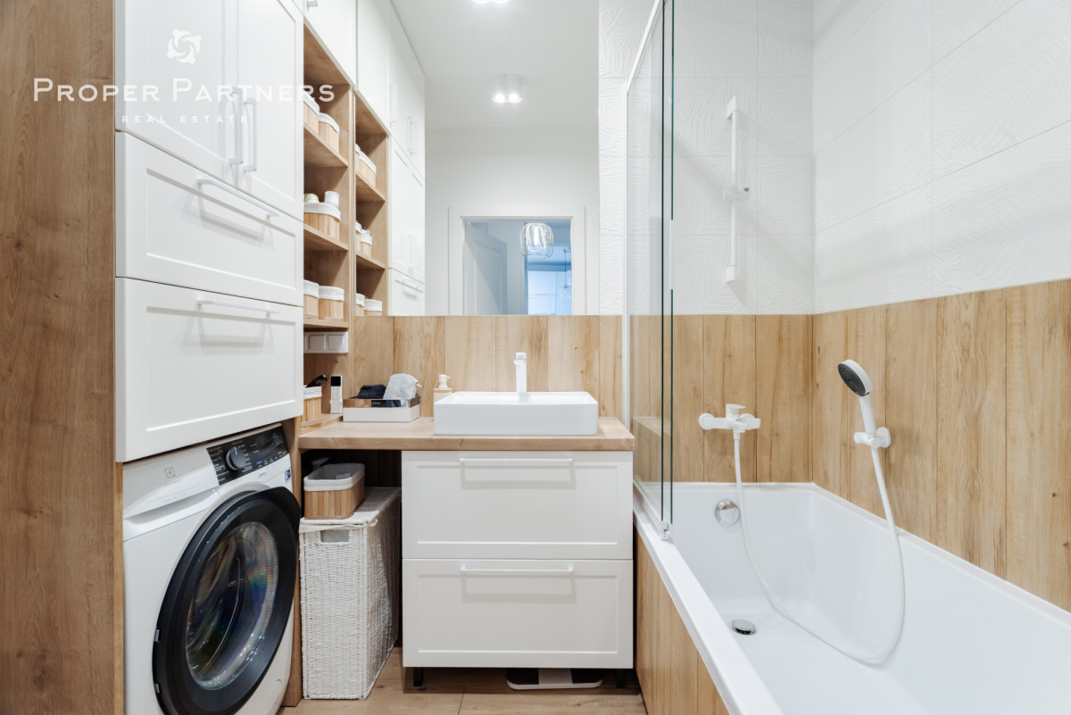 - Łazienka(4,41 m²) - elegancka i w pełni wyposażona - wanna z funkcją prysznica, WC z funkcją bidetu, zabudowana pralko-suszarka oraz wysokiej jakości armatura w czarnym wykończeniu.