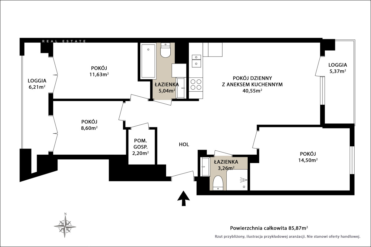 Mieszkanie o powierzchni 85,87 m² składa się z: