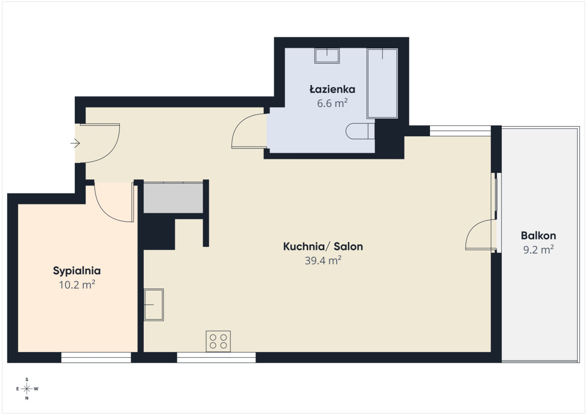 Ekspozycja mieszkania obejmuje trzy strony świata, co zapewnia dobre doświetlenie wnętrz przez cały dzień.