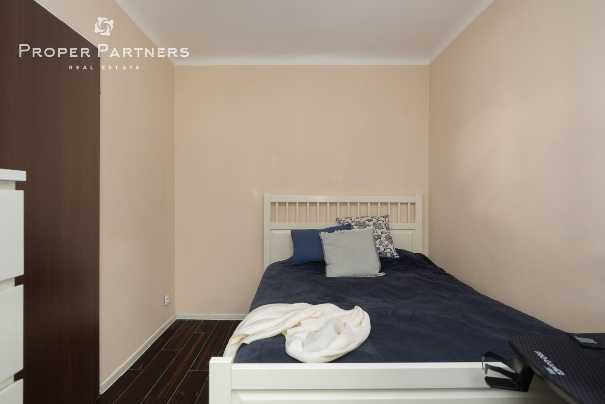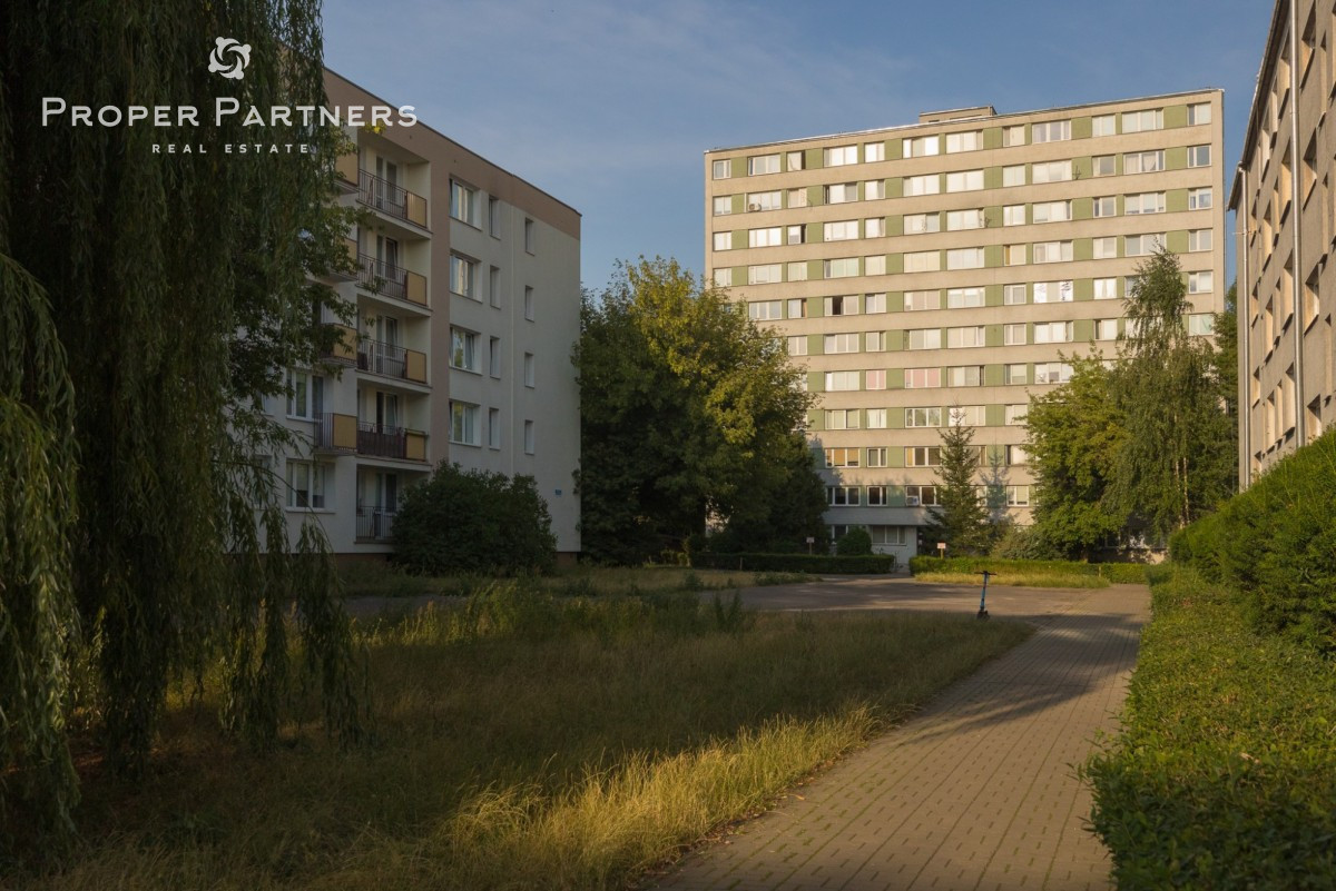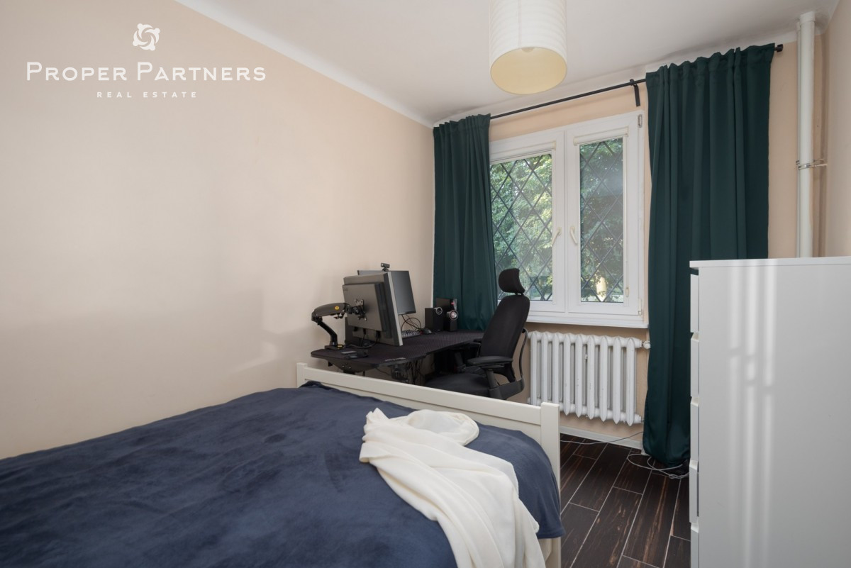 Blok położony jest w cichej i zielonej okolicy. Z okna widać drzewa. Mieszkanie znajduje się na wysokim parterze na oknach założone zostały zewnętrzne kraty.