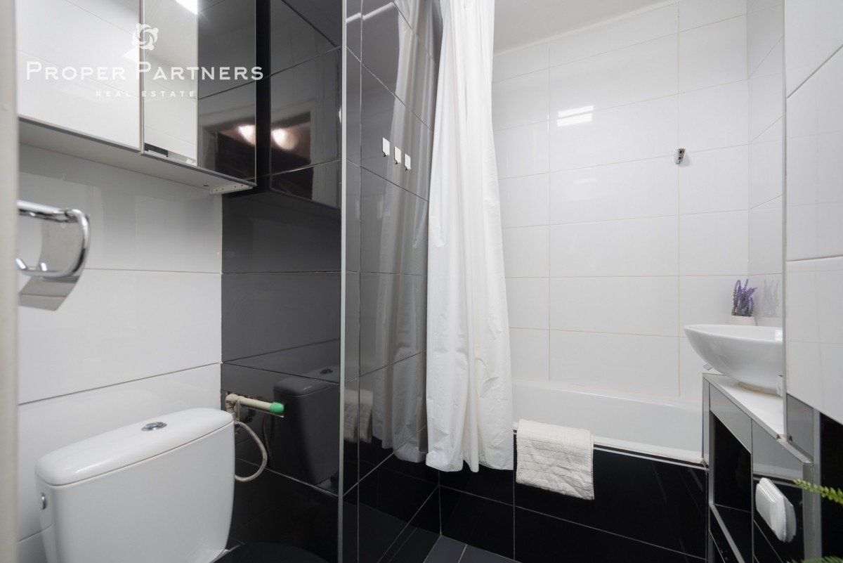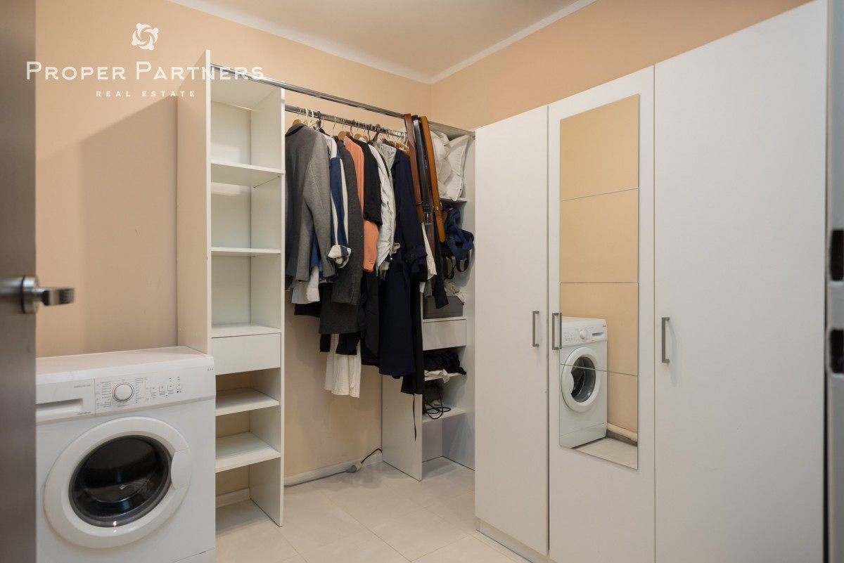 W salonie znajduje się rozkładana kanapa, stół z krzesłami oraz komoda. W sypialni stoi łózko oraz komoda. W przedpokoju stoi szafka na buty. W garderobie stoi pojemna szafa i dodatkowe półki do przechowywania ubrań oraz pralka.