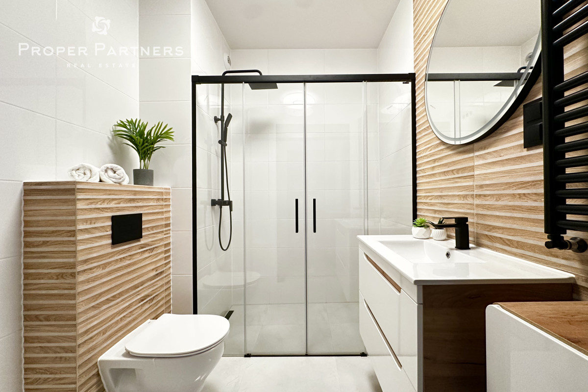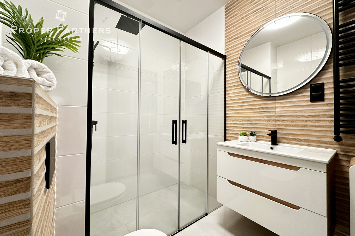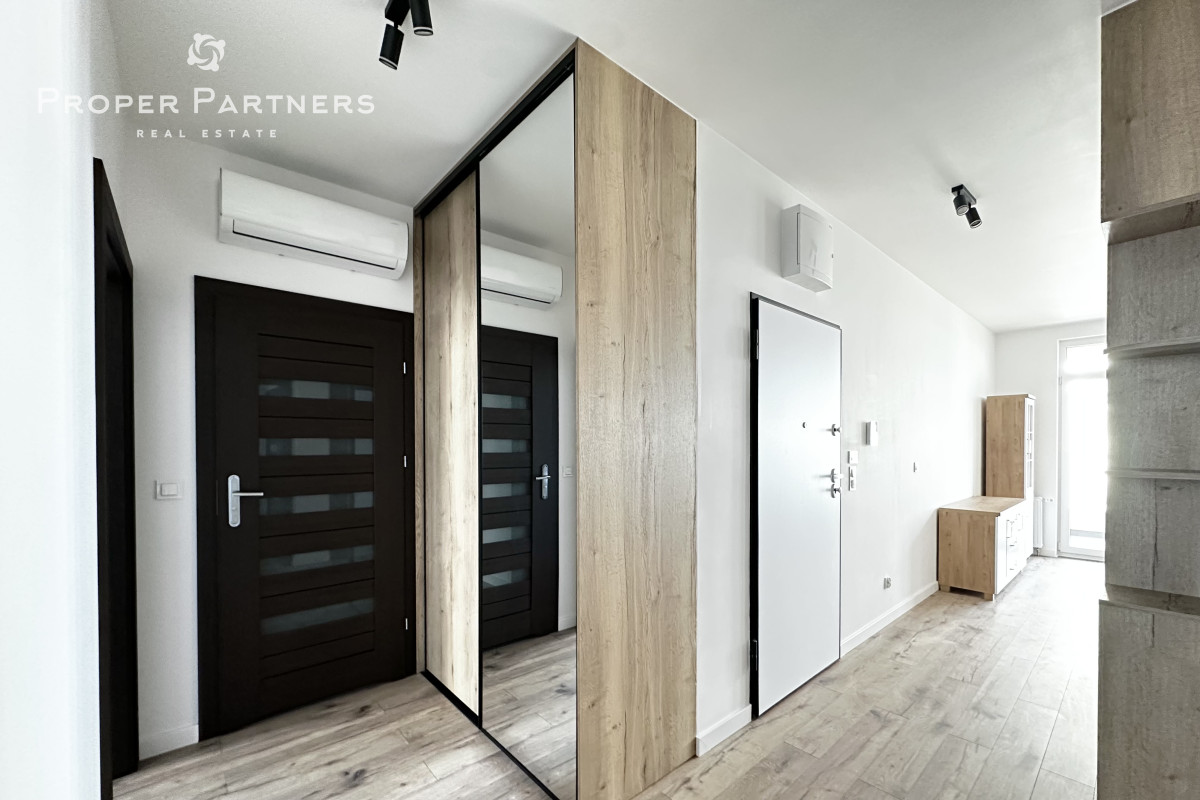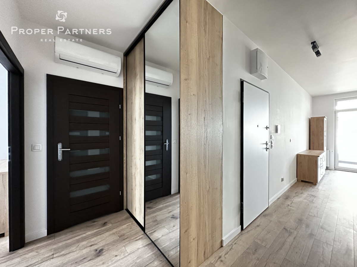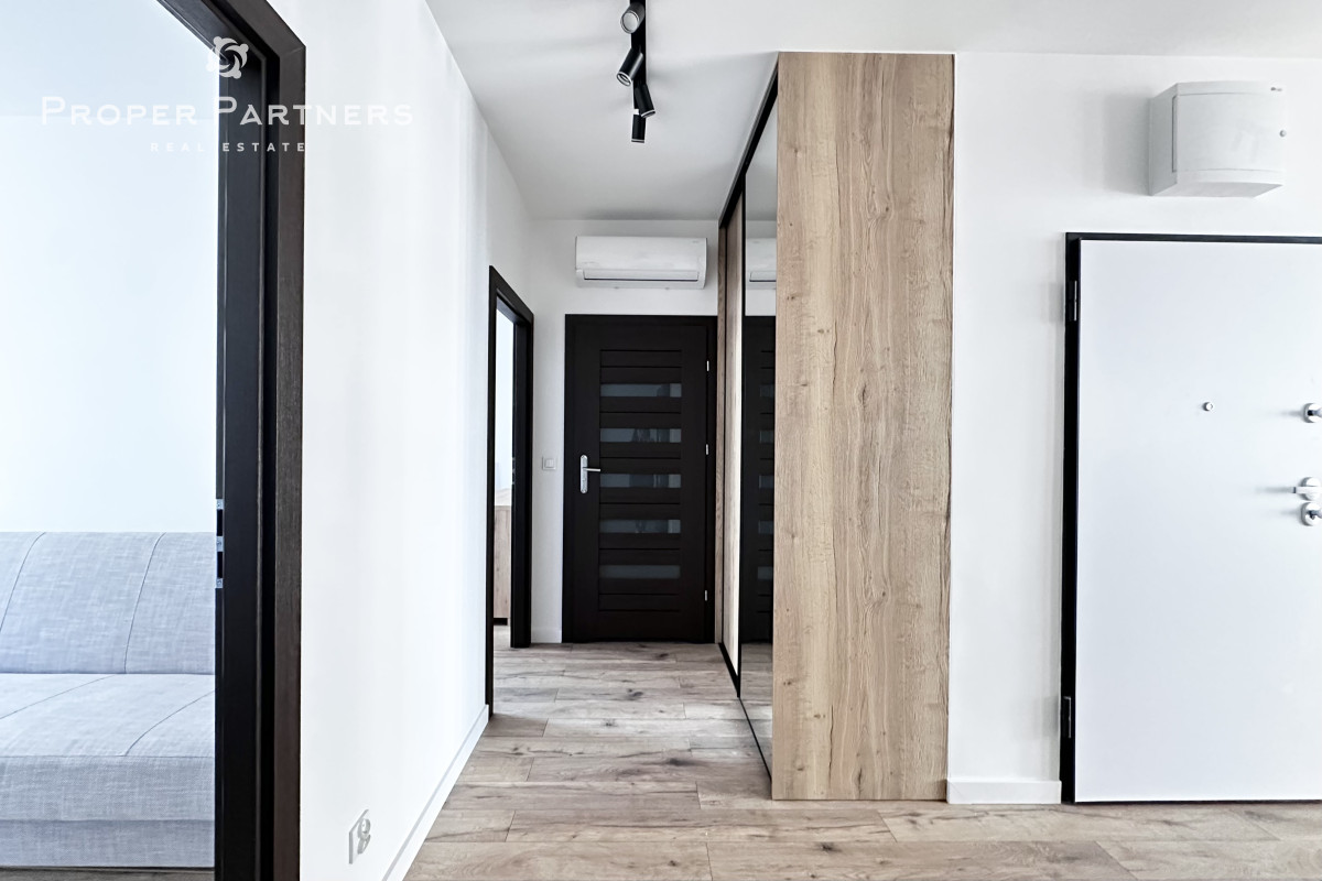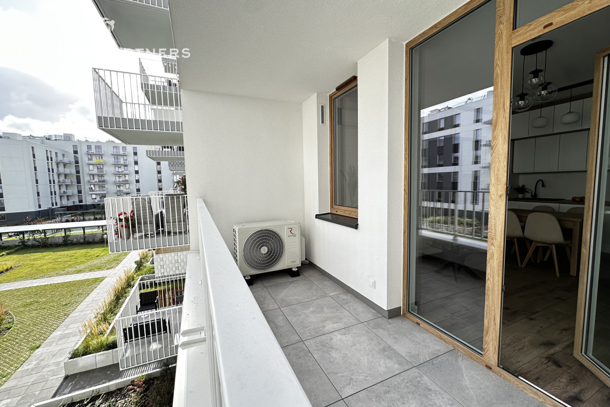 Meble w są mieszkaniu zrobione na wymiar. W salonie i w przedpokoju zamontowane zostały jednostki klimatyzacyjne. Właściciel jest otwarty na to, by doposażyć mieszkanie według potrzeb najemcy.
