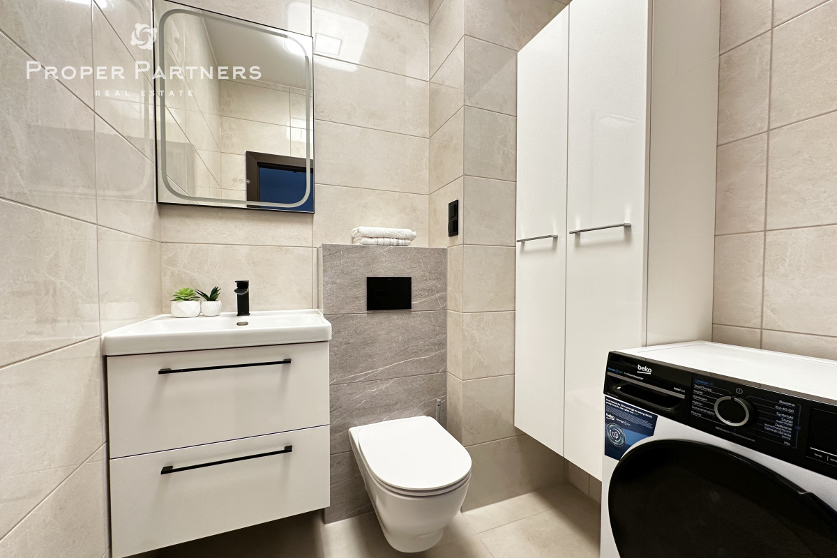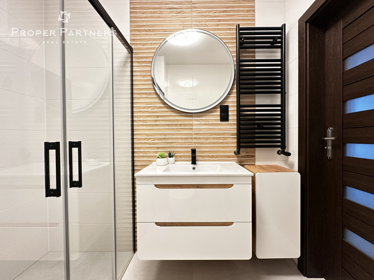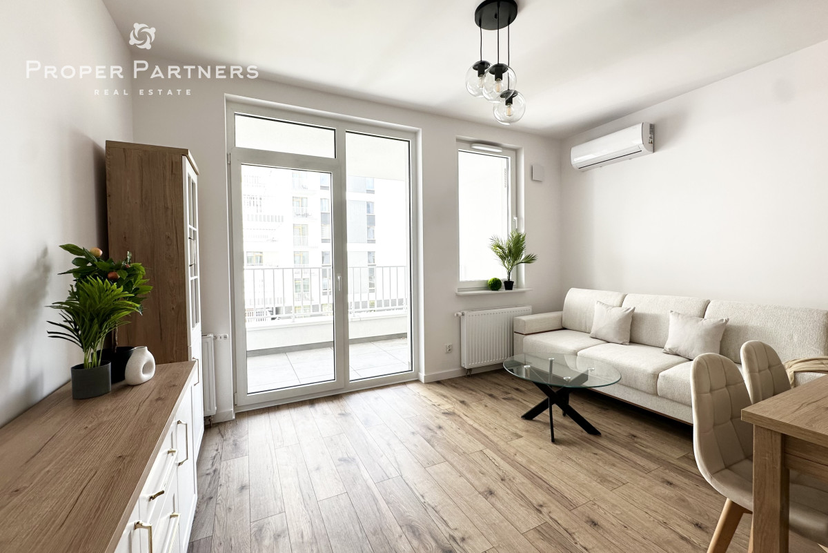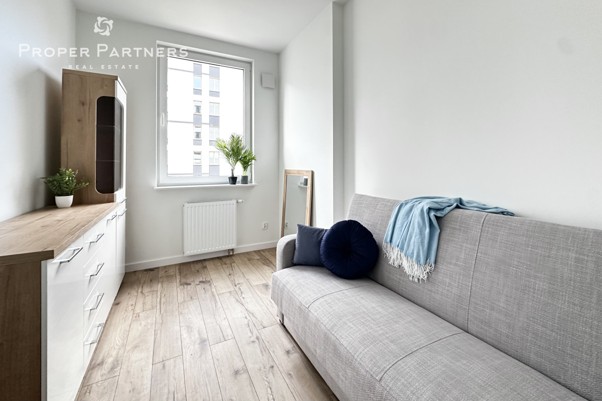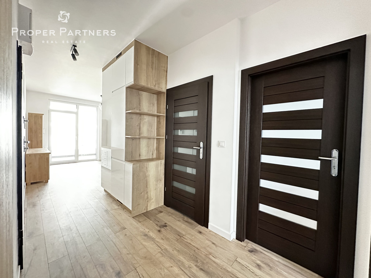 Meble w są mieszkaniu zrobione na wymiar. W salonie i w przedpokoju zamontowane zostały jednostki klimatyzacyjne. Właściciel jest otwarty na to, by doposażyć mieszkanie według potrzeb najemcy.