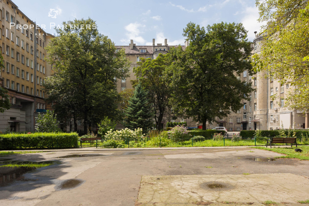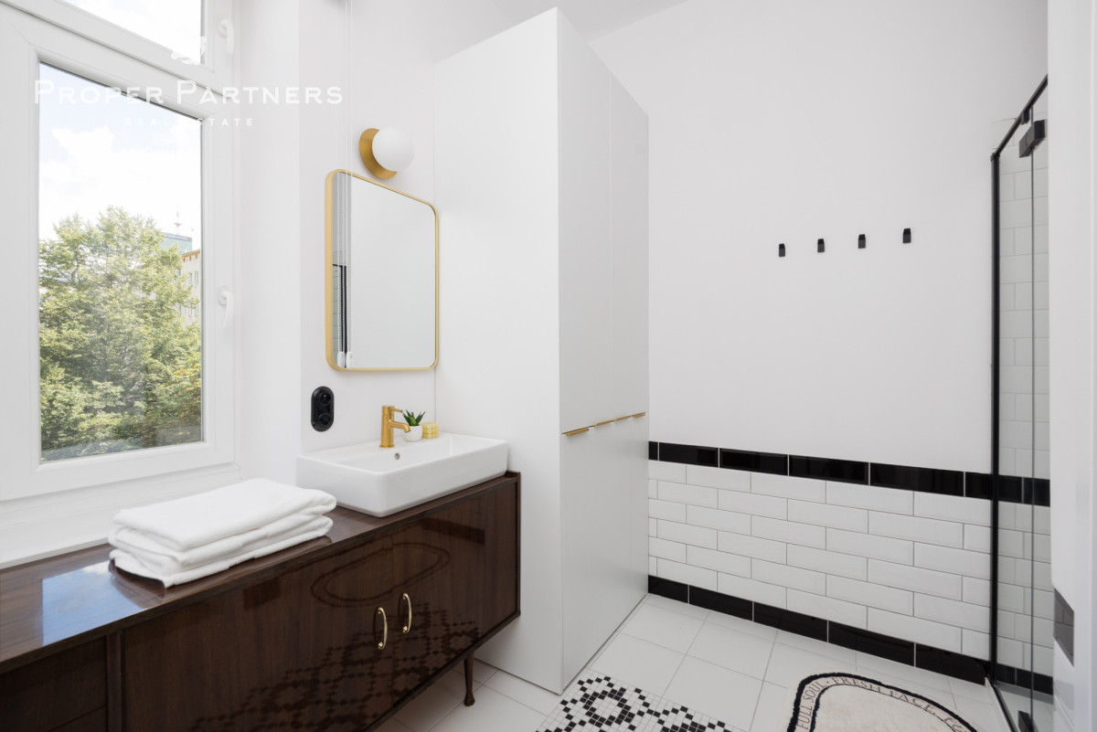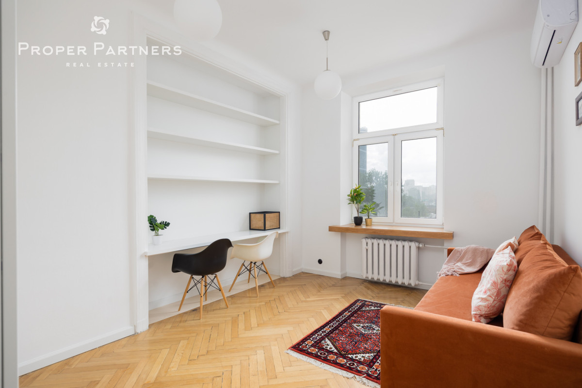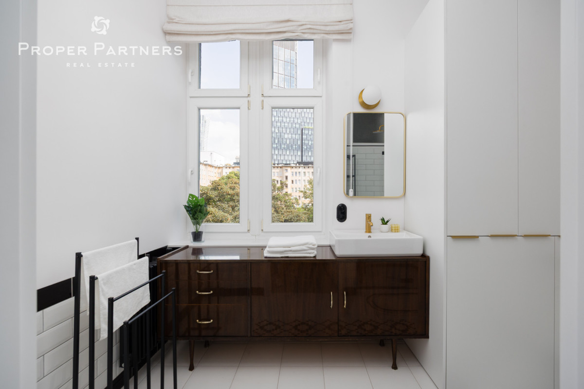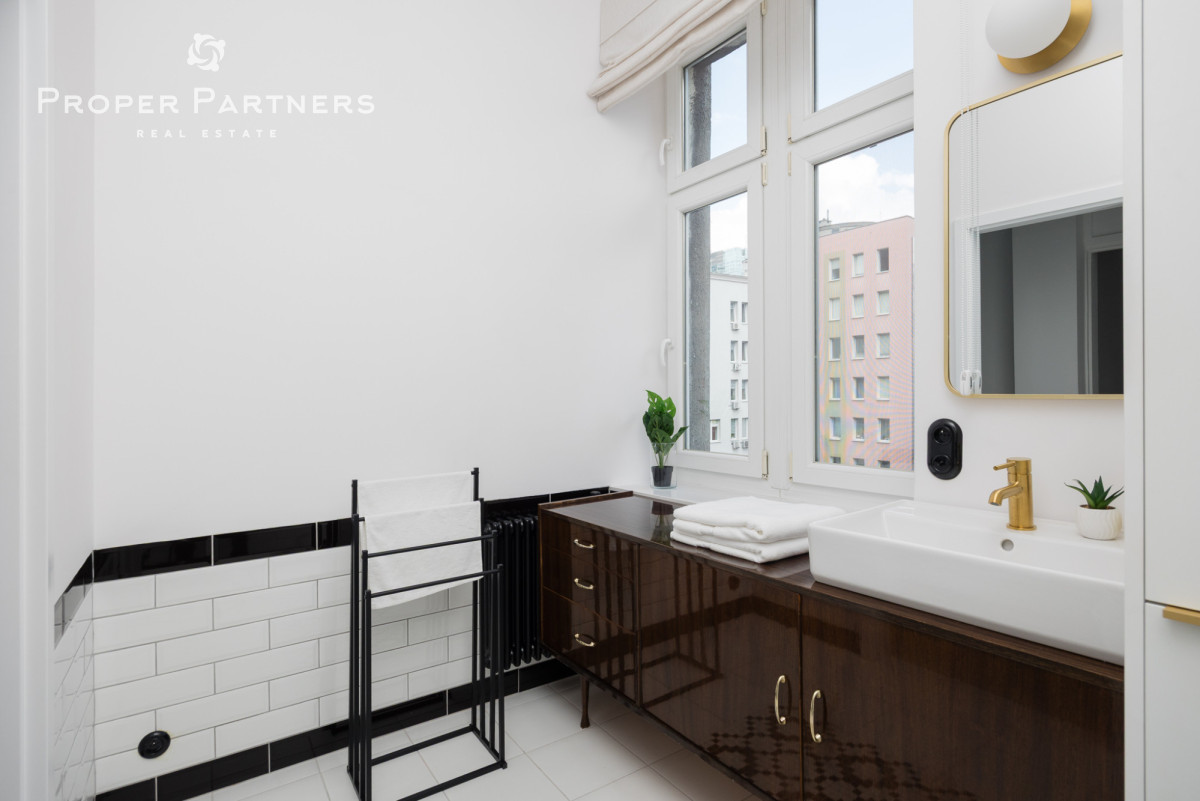 Całe mieszkanie jest nowocześnie wykończone, jednak zachowany został w nim klimat lat czterdziestych - na podłodze oryginalny parkiet, oryginalne drzwi wejściowe oraz wewnętrzne. Z okien w łazience oraz kuchni widać Pałac Kultury oraz nowoczesny biurowiec Varso.
