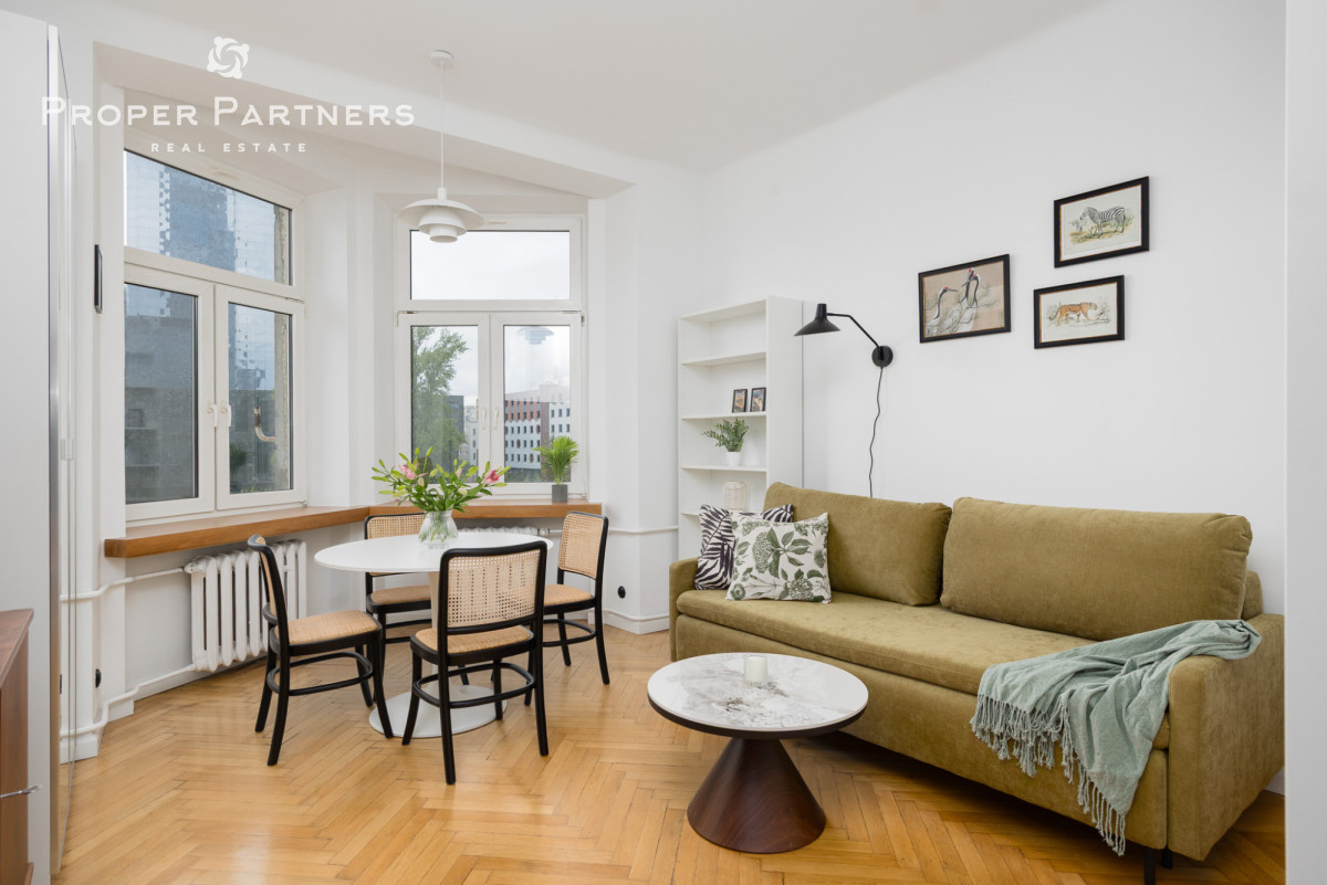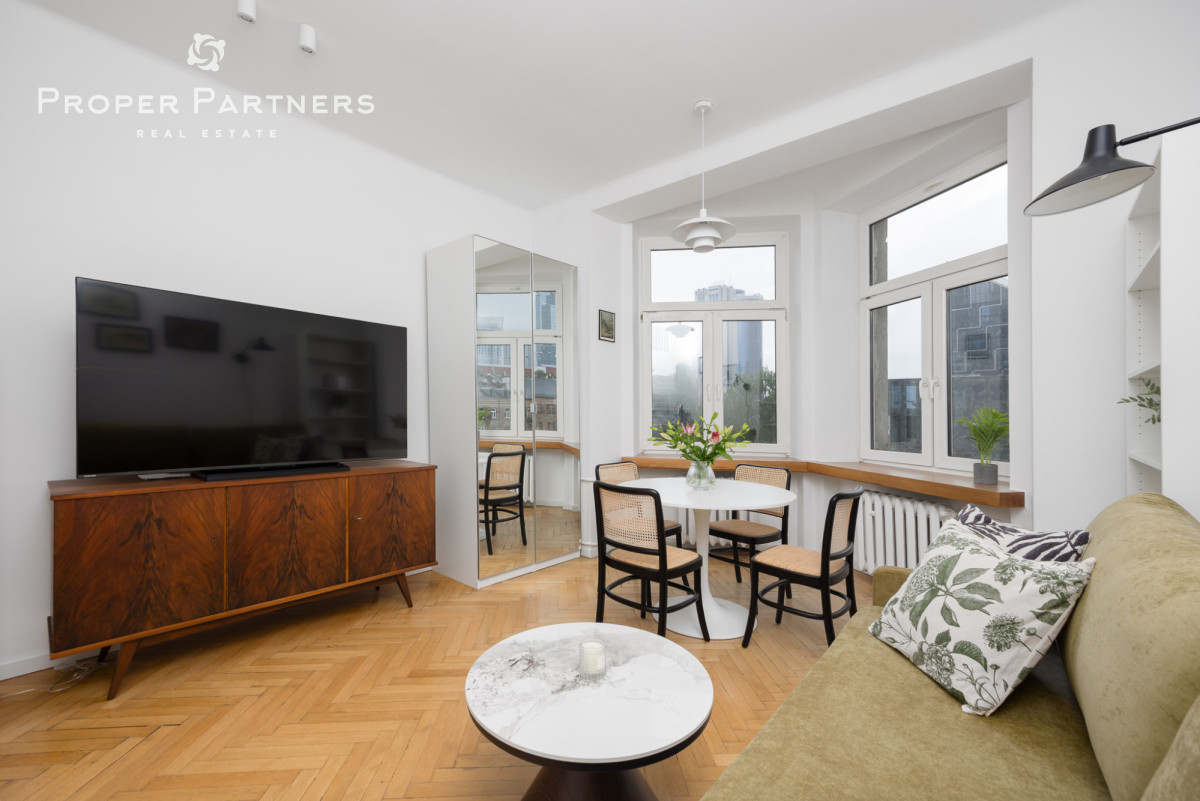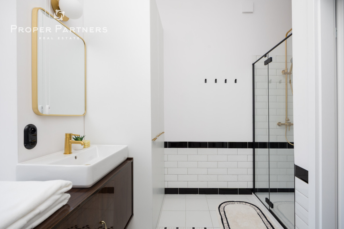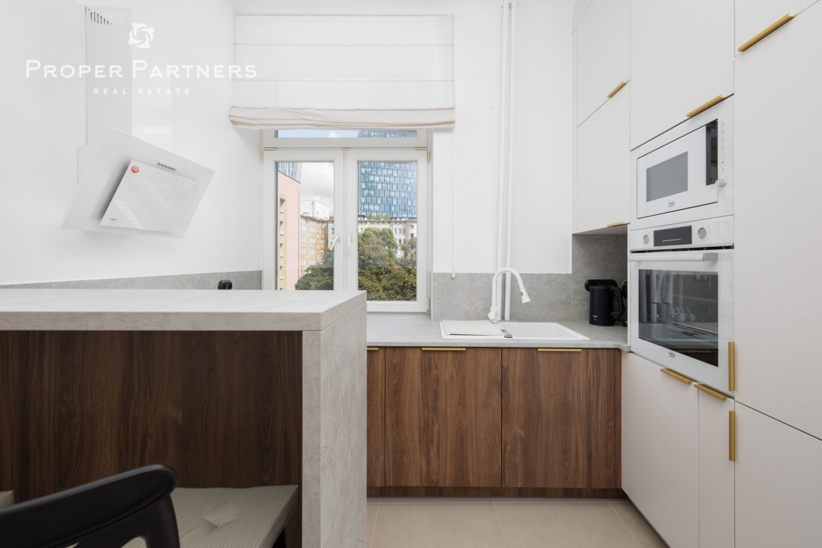 Całe mieszkanie jest nowocześnie wykończone, jednak zachowany został w nim klimat lat czterdziestych - na podłodze oryginalny parkiet, oryginalne drzwi wejściowe oraz wewnętrzne. Z okien w łazience oraz kuchni widać Pałac Kultury oraz nowoczesny biurowiec Varso.