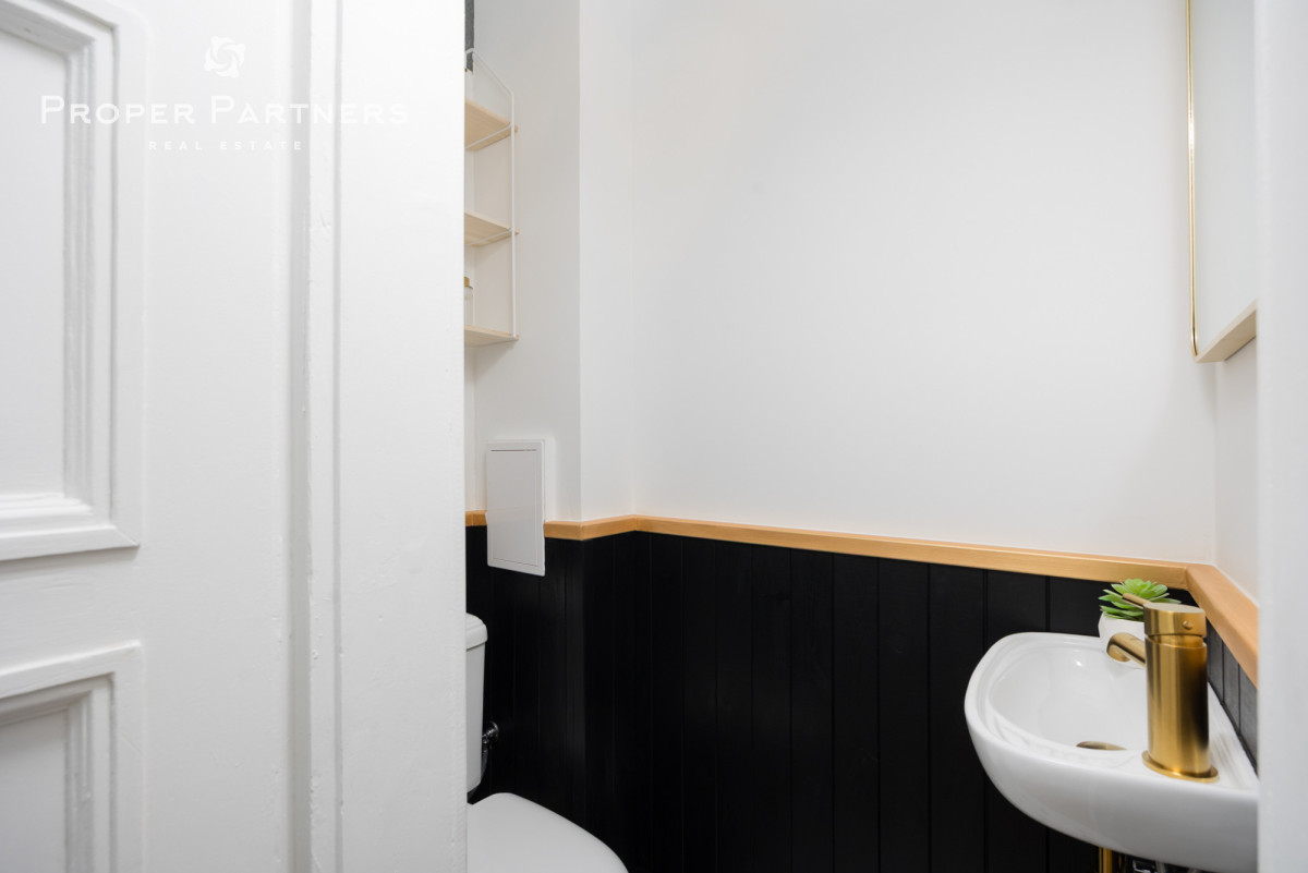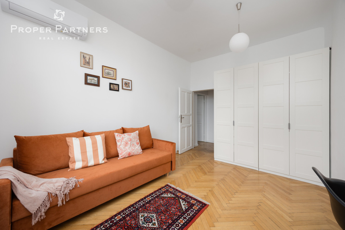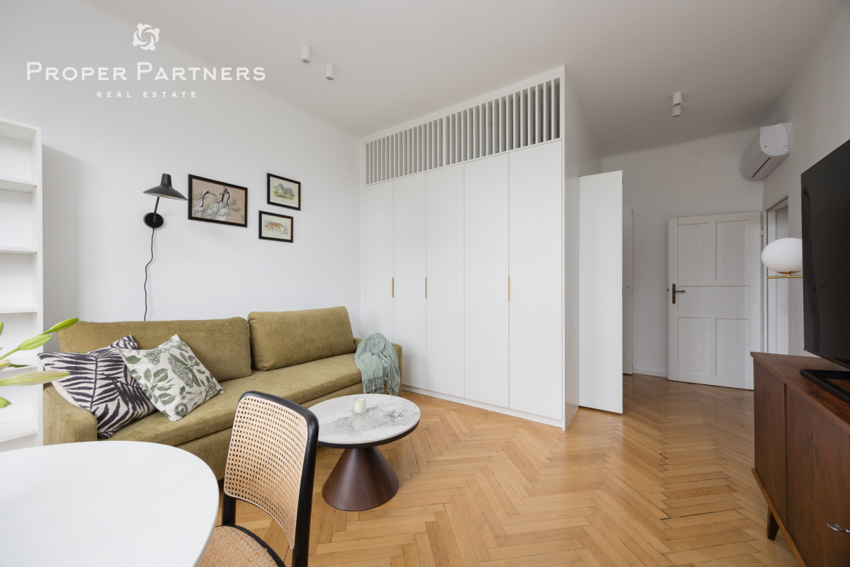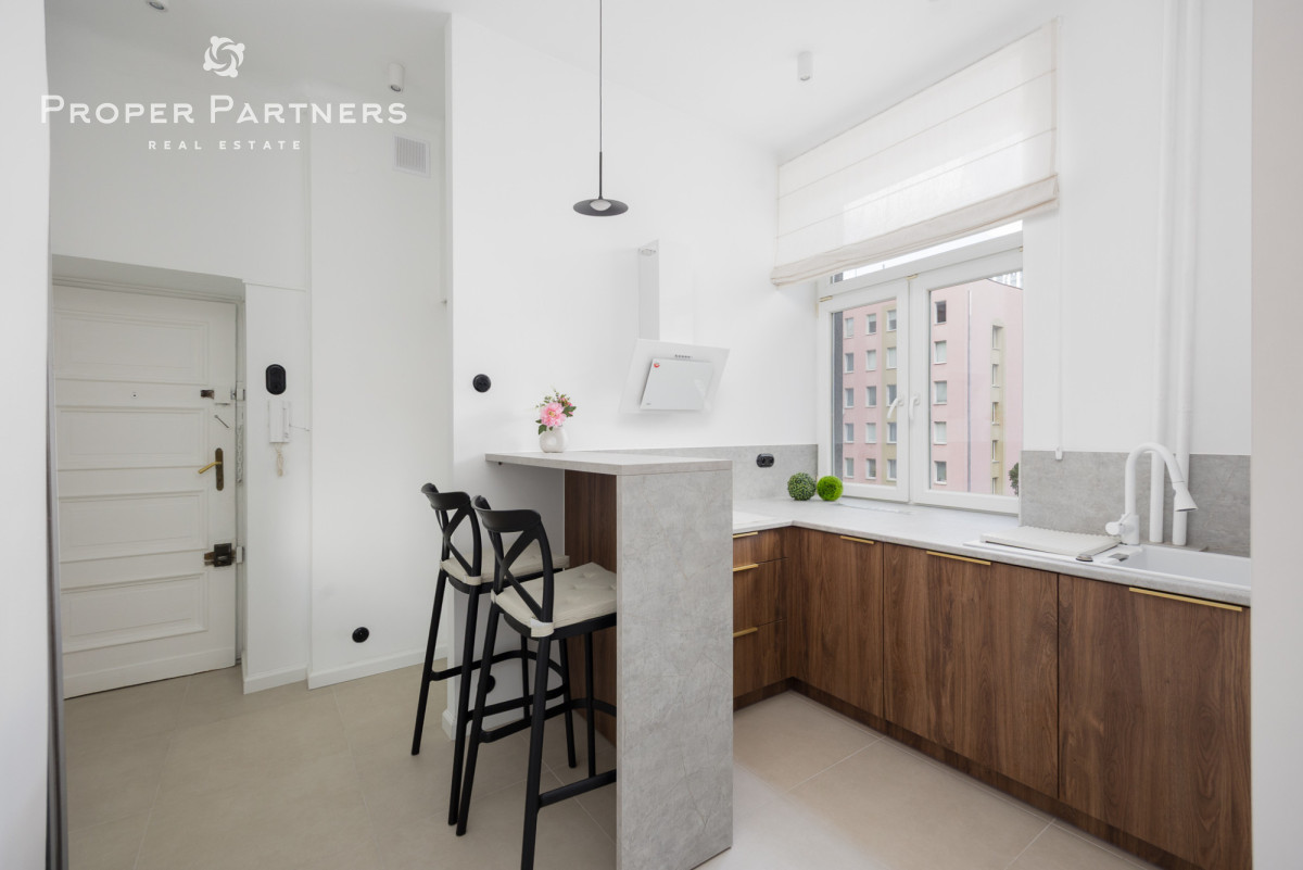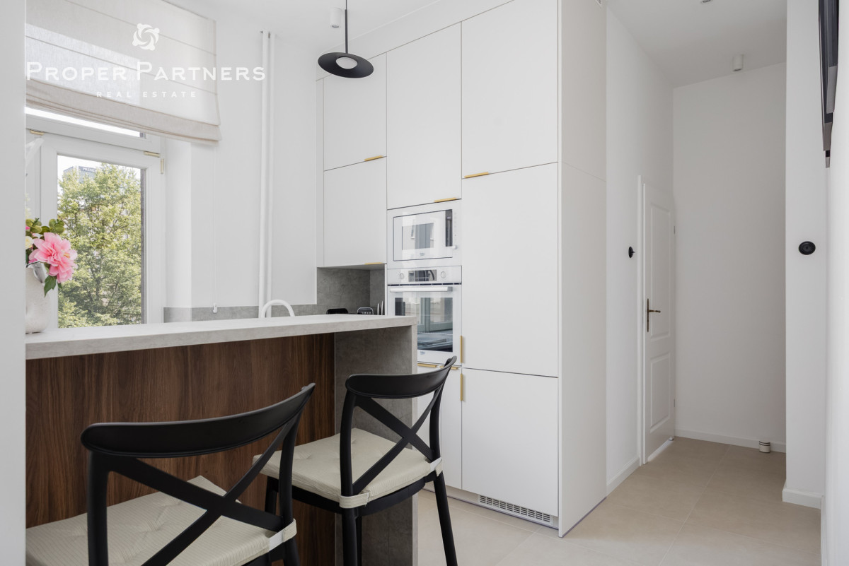 Całe mieszkanie jest nowocześnie wykończone, jednak zachowany został w nim klimat lat czterdziestych - na podłodze oryginalny parkiet, oryginalne drzwi wejściowe oraz wewnętrzne. Z okien w łazience oraz kuchni widać Pałac Kultury oraz nowoczesny biurowiec Varso.