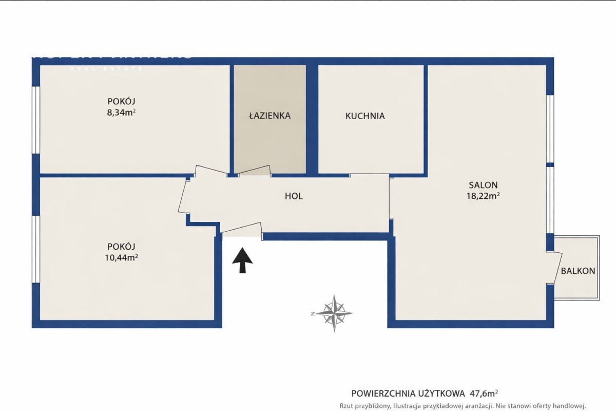 Po jednej stronie są dwie sypialnie, naprzeciw wejścia łazienka a po przeciwnej stronie mieszkania znajduje się salon z wyjściem na na balkon i kuchnia częściowo otwarta na salon.